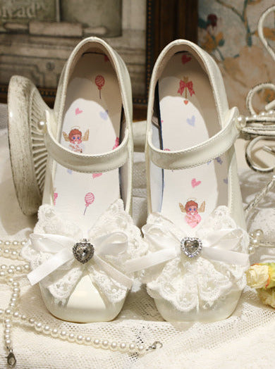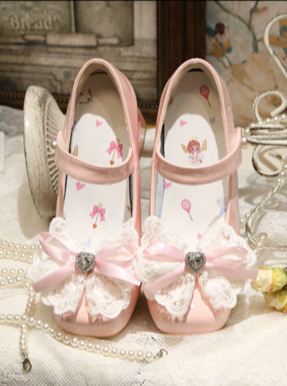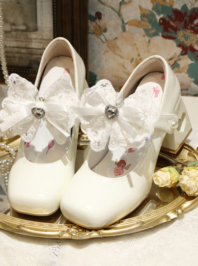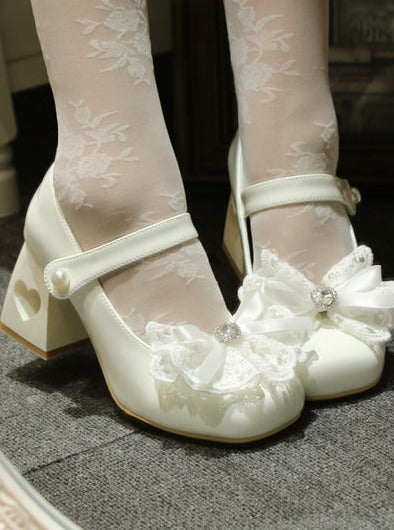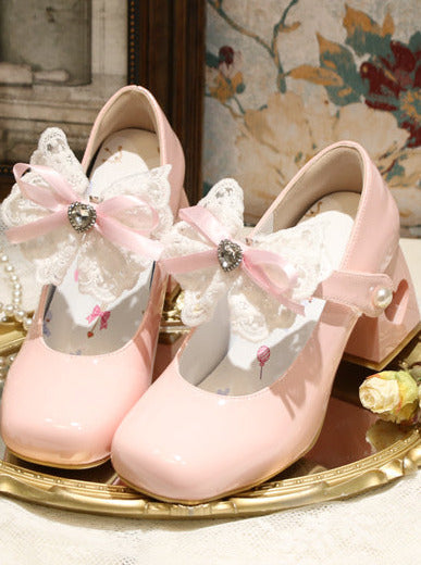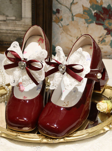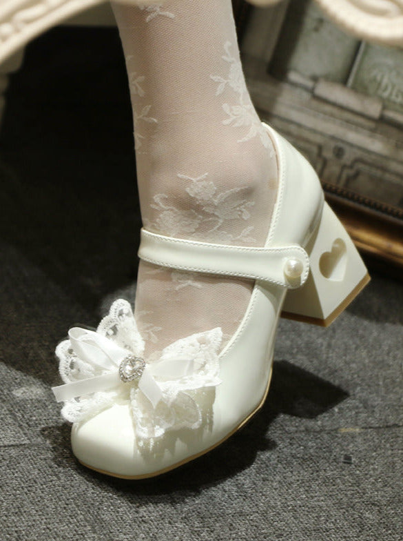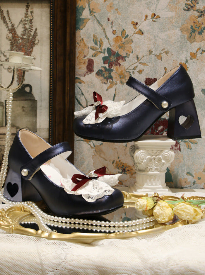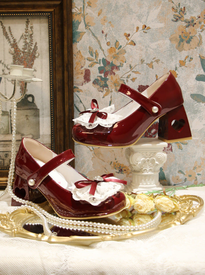 エレガントなフレンチスクエアレースリボンシューズヒールトゥロリータラブ