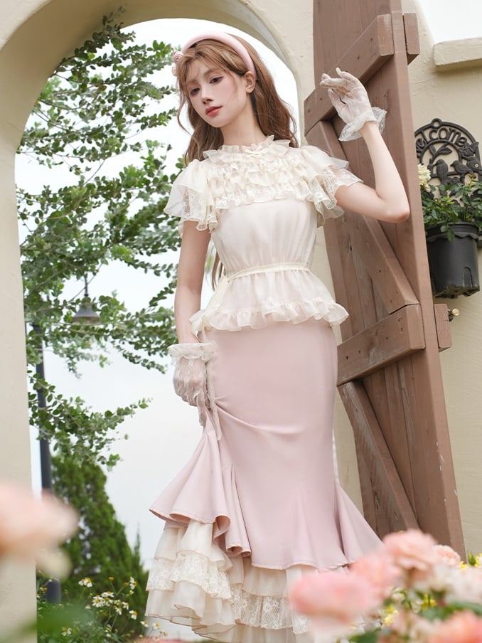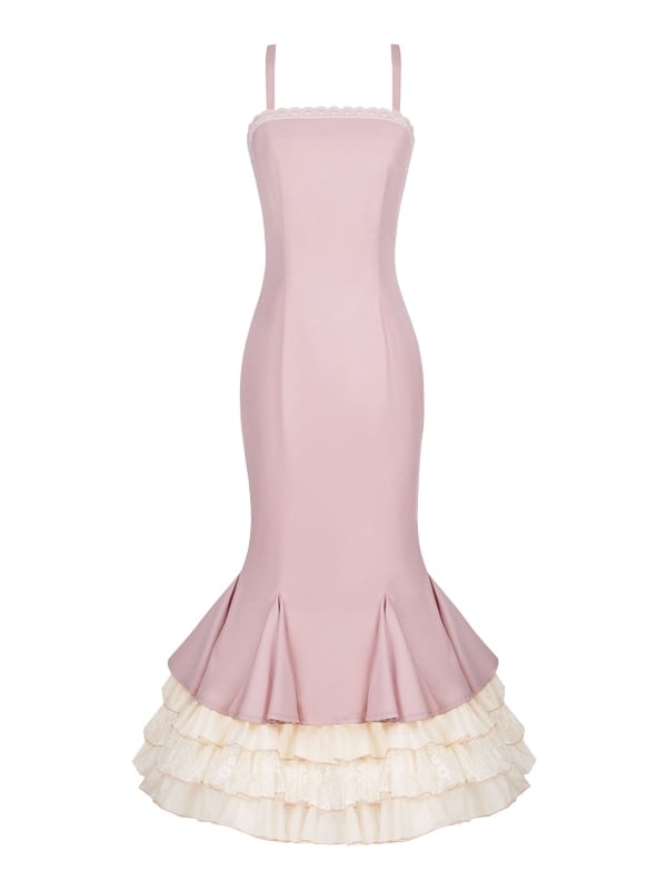3層フリル裾ピンクエレガントスリップマーメイドドレス