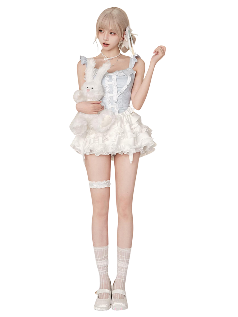 愛らしいエルフのサスペンダースカートとトップスの組み合わせは、ブルーとホワイトのケーキカラーで展開。夏のワードローブにぴったりです。軽くて風通しの良い素材で仕立てられており、アウトドアやピクニックにぴったりの一着です。キュートなカーディガンを羽織れば、街中で一番キュートなエルフに変身。