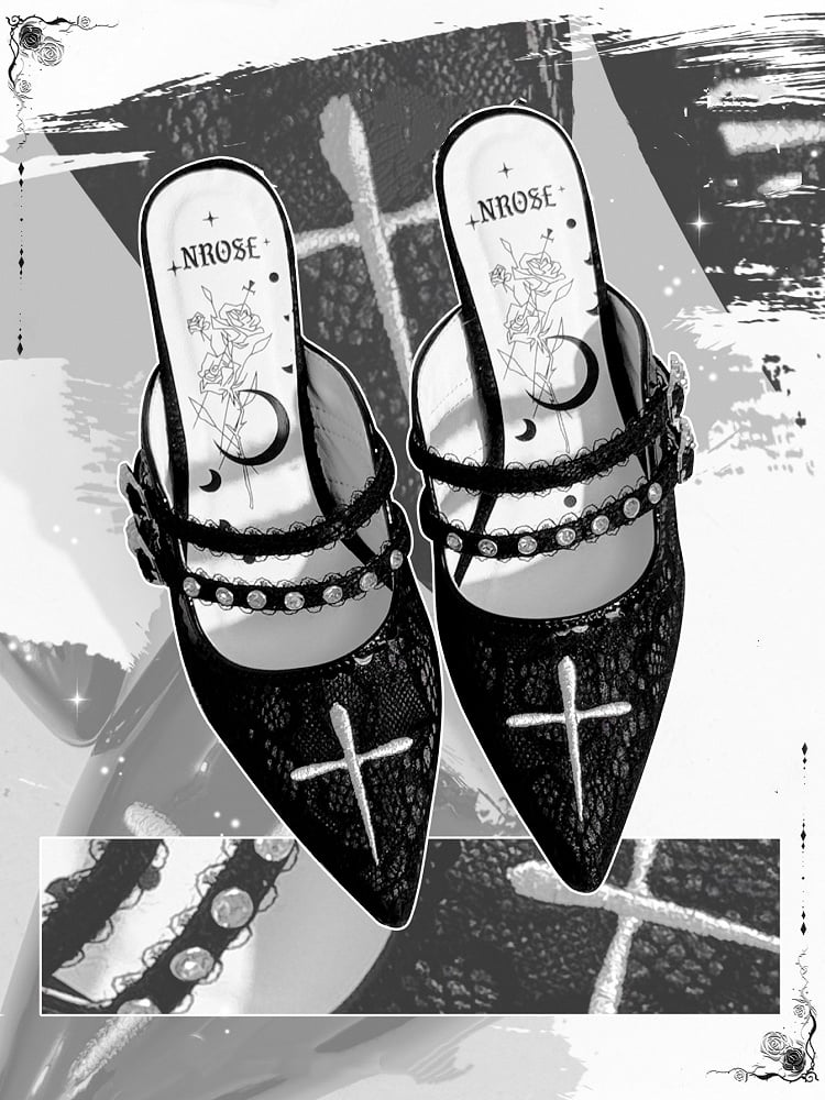 Gothic Pointed Toe Black Lace Sandals 6cm Stiletto Heel with Cross Embroidery