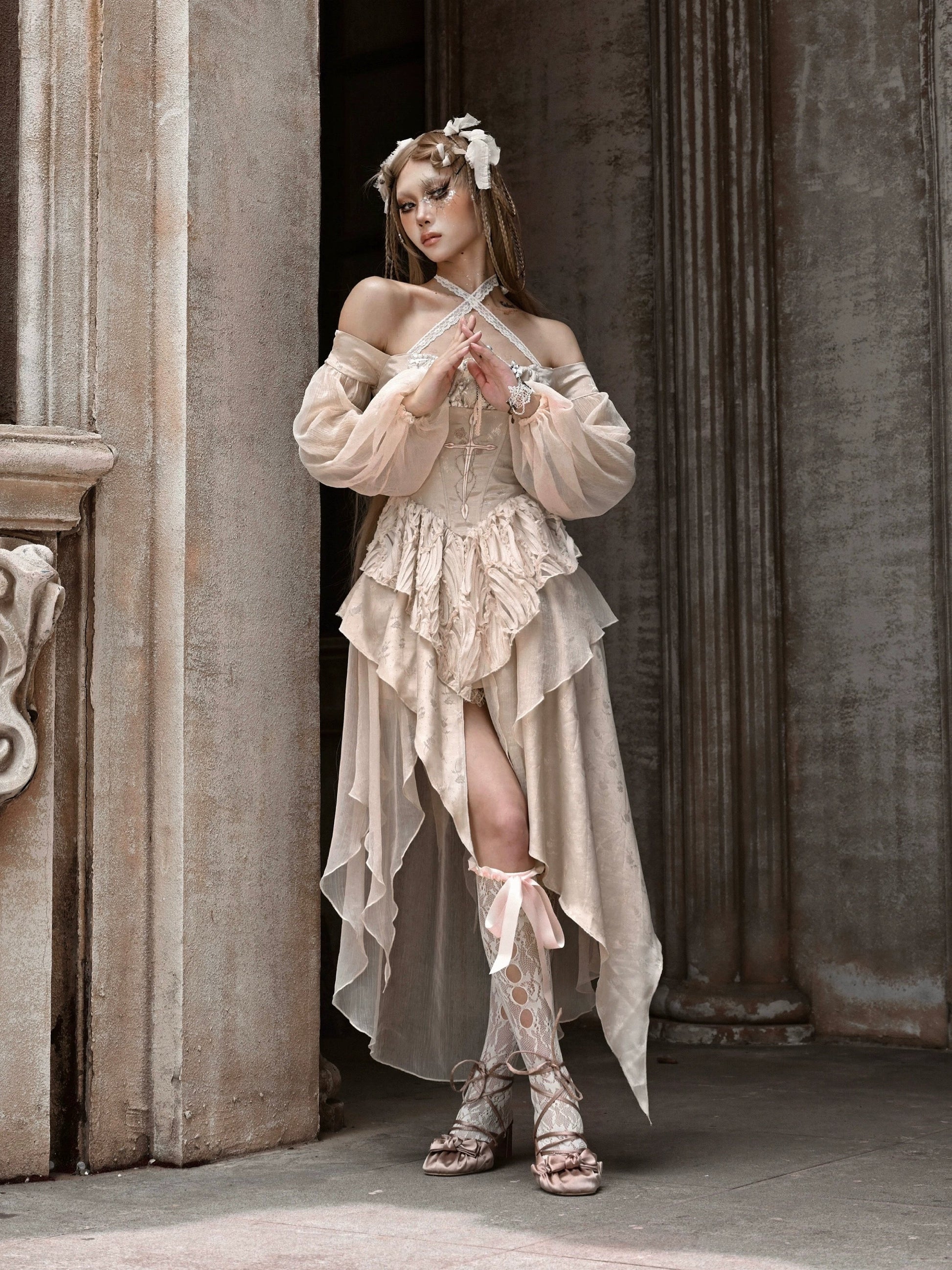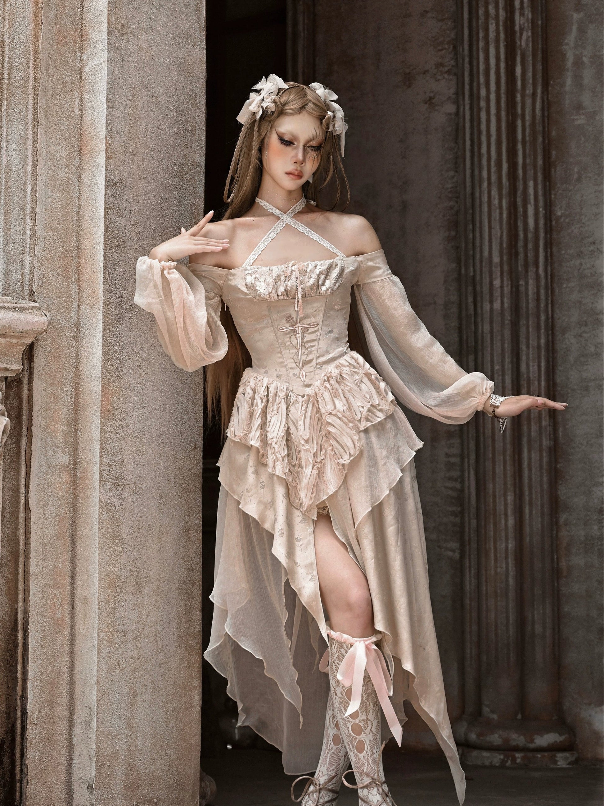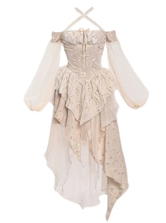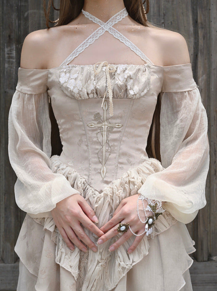 刺繍クロスランタンゴールドスレッドドレスバレエスリーブブロークンオフショルダー