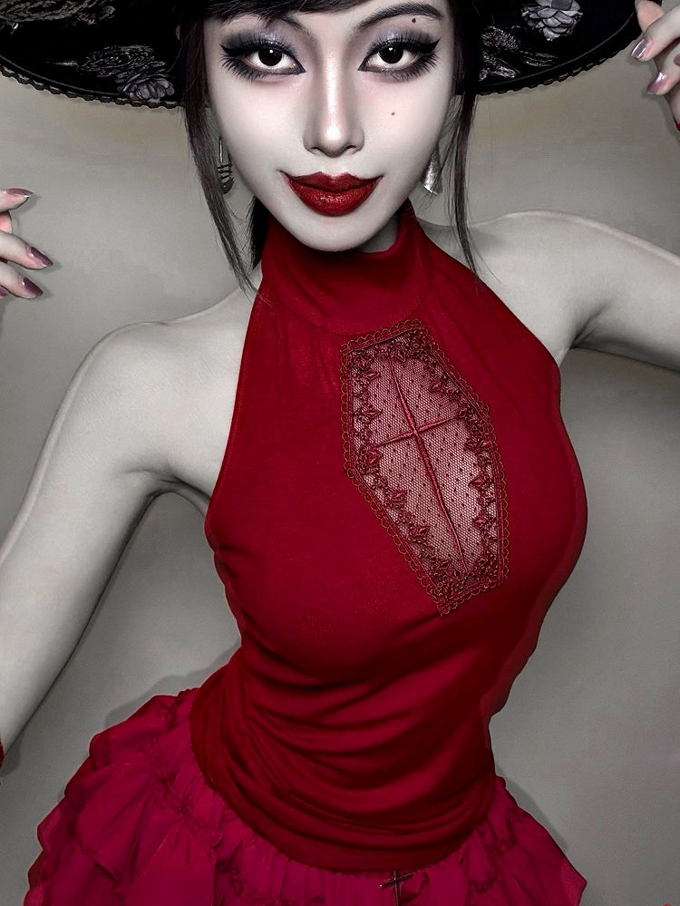 Gothic Red Halter Vest with Coffin Cut-Out & Cross Embroidery
