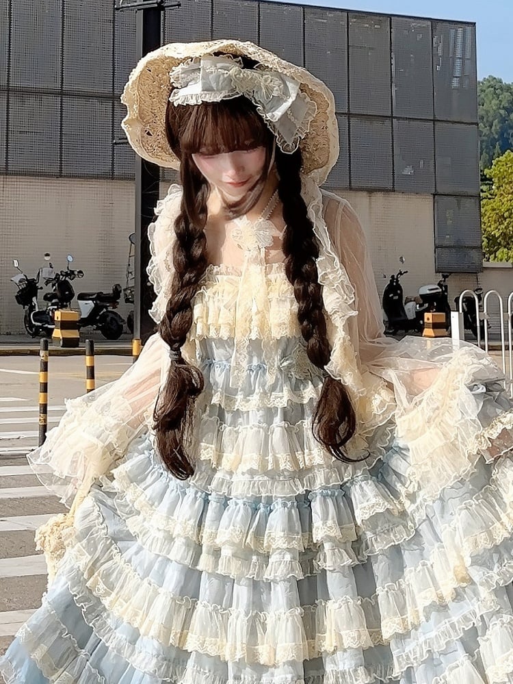 青と白のオールドスクールロリータファッションドレス 蝶結びディテール JSK セット