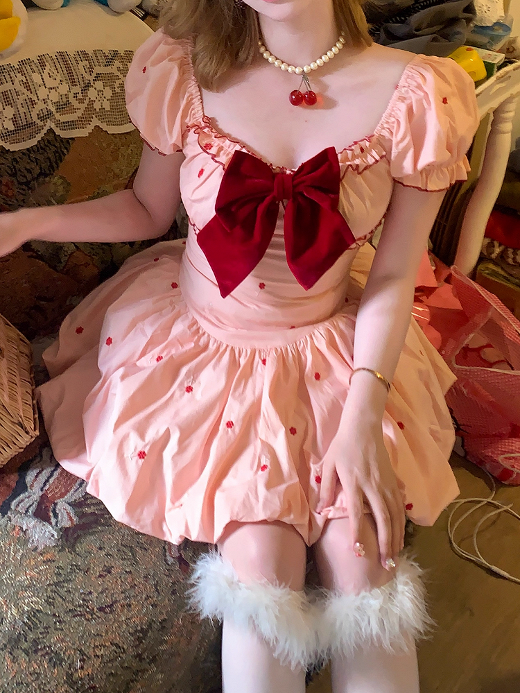 ● Big Bow / Contrast Trim / Floral Embroidery / Square Neckline and Short Puff Sleeves