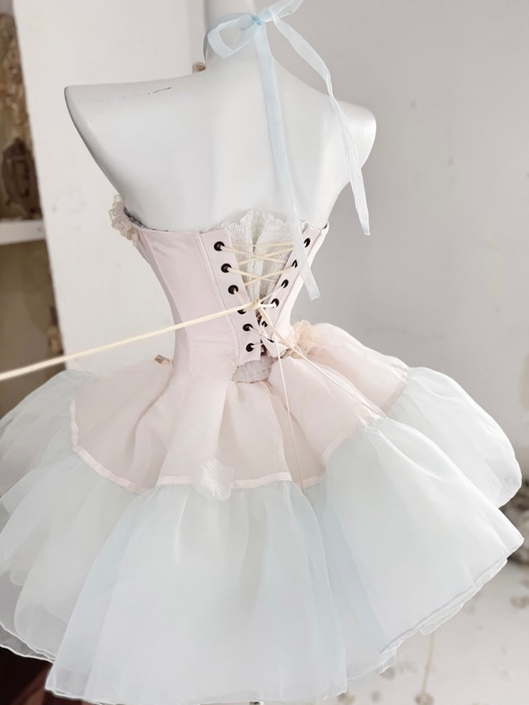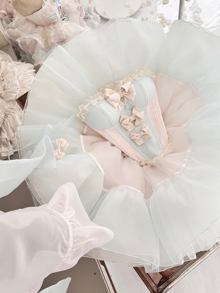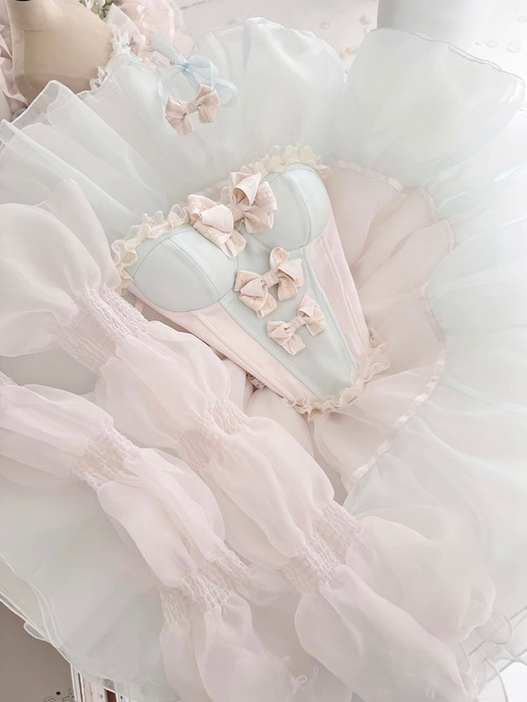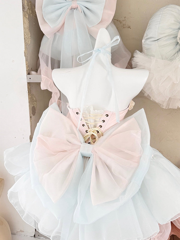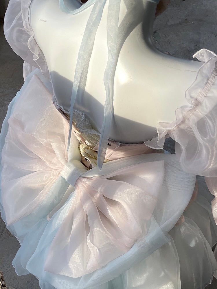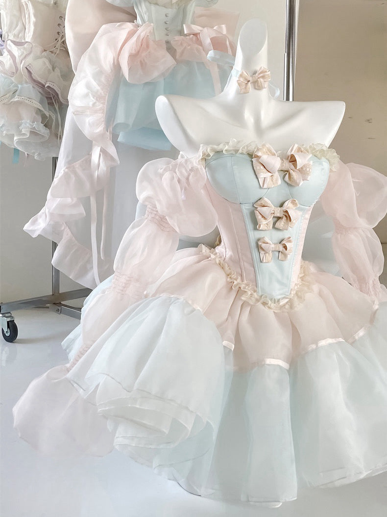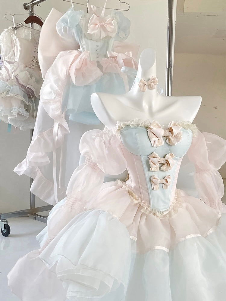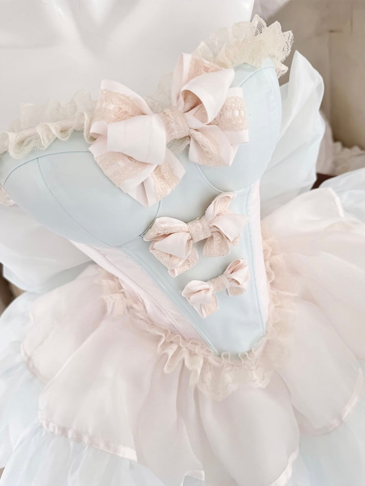 青と白のオールドスクールロリータファッションドレス 蝶結びディテール JSK セット