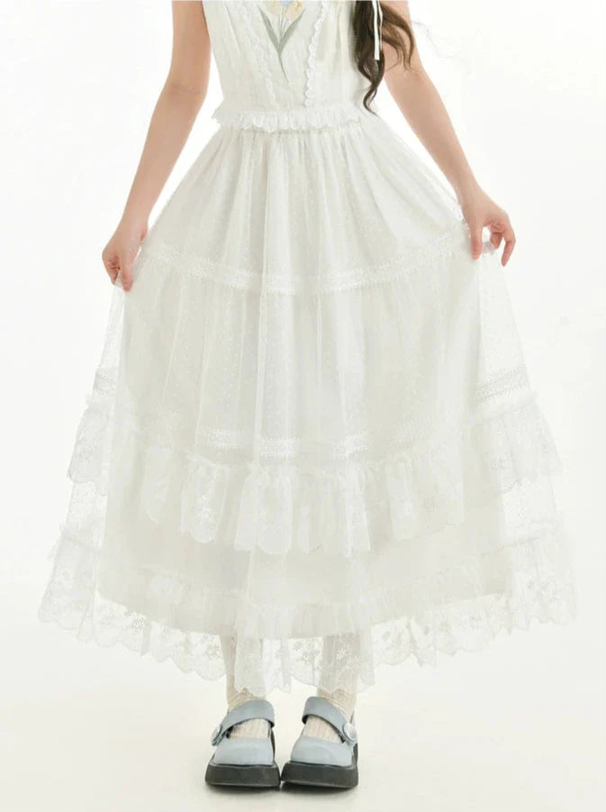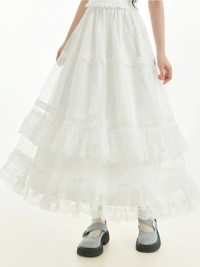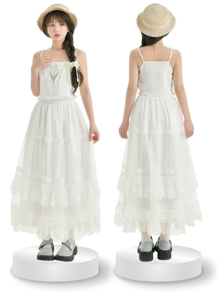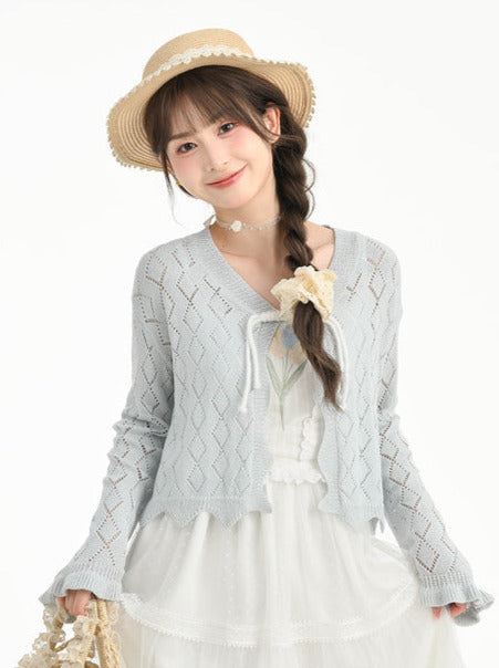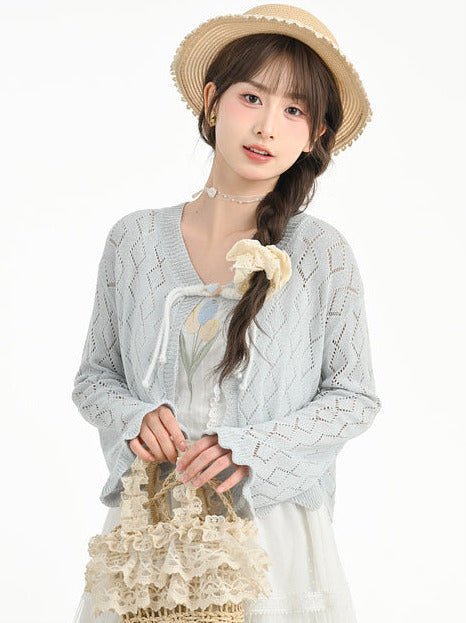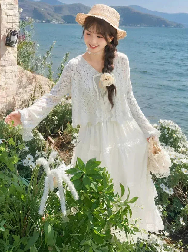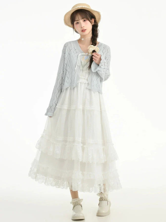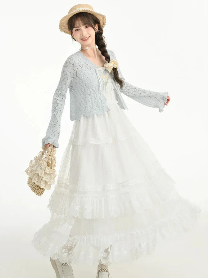 フェアリー風透かし編みニットカーディガン + キャミソールトップス + ロングケーキスカート