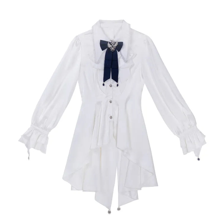 ホワイトの長袖、尖ったフラットカラーの王子様風ファッションロングシャツ