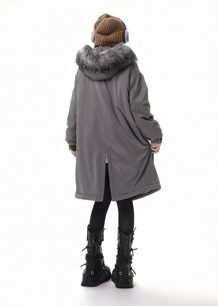 フェイクファーカラーのグレーコートで、冬のワードローブにキュートなアクセントを。袖にあしらわれたチャーミングな星のアップリケが、暖かく快適な着心地を保ちながら、あなたを輝かせます。どんなシーンにもぴったり。今シーズンもスタイリッシュで愛らしい装いを。
