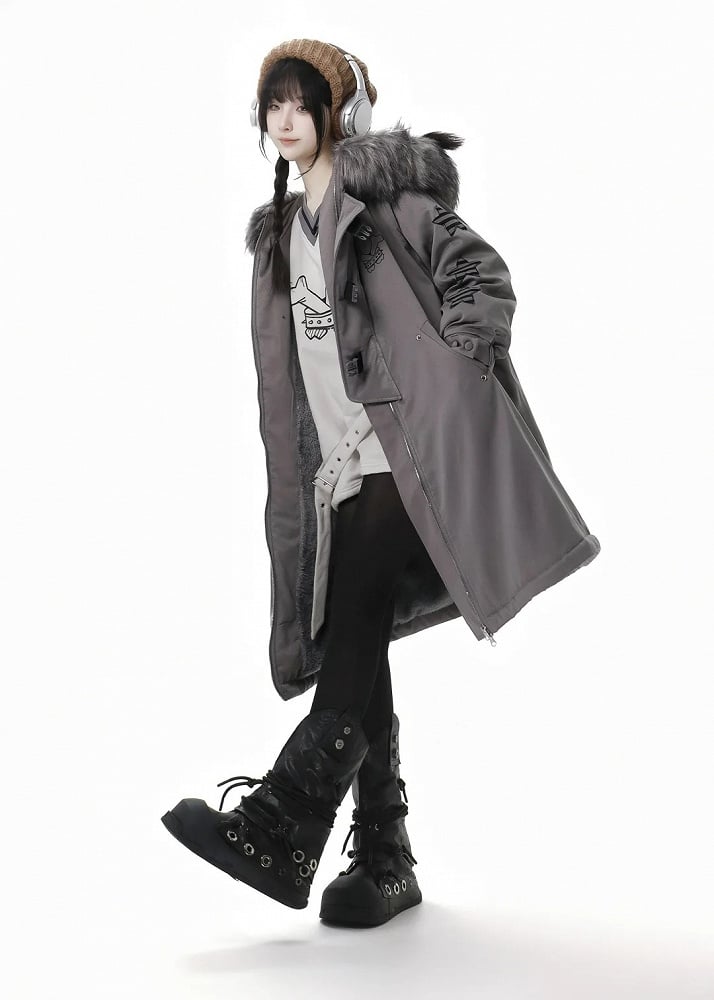 袖に星のアップリケが付いたフェイクファーカラーのグレーコート
