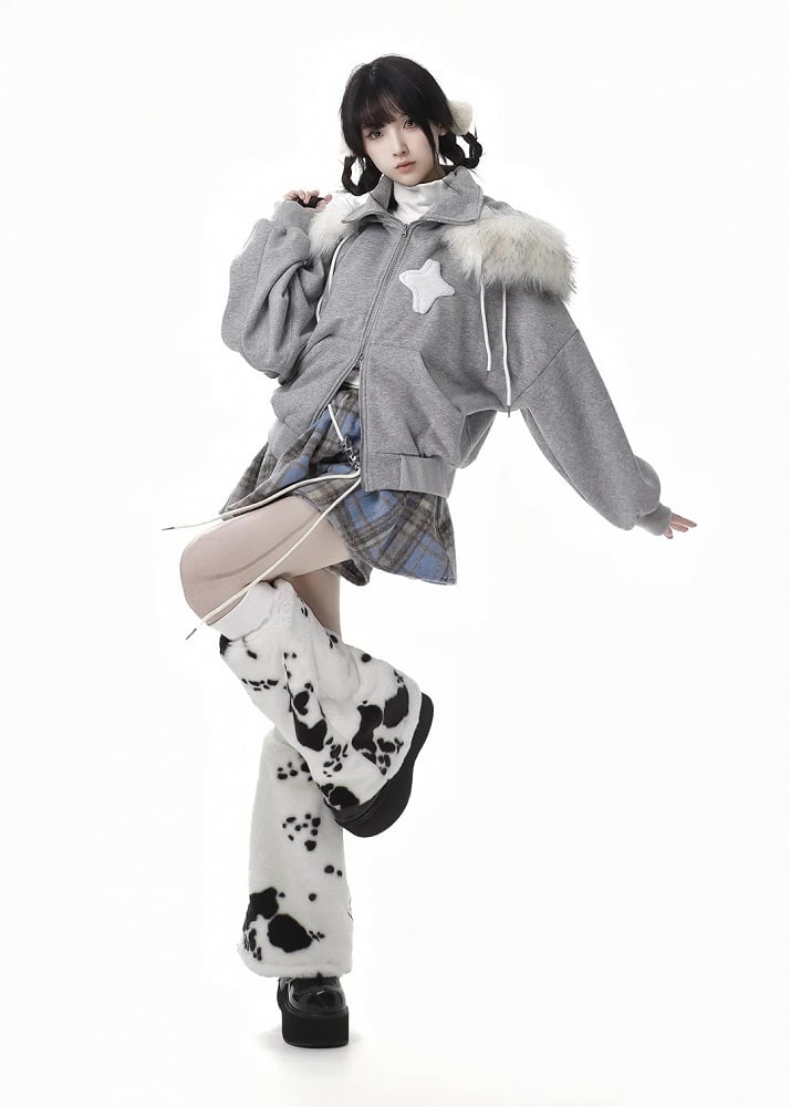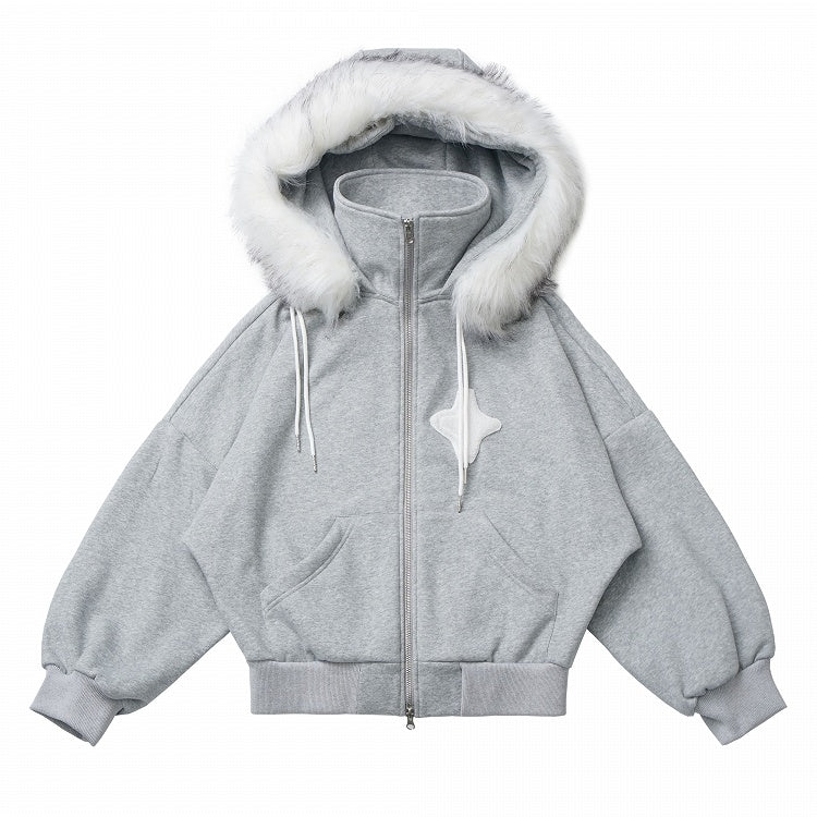 フェイクファーカラーのスターアップリケ付きグレーコート