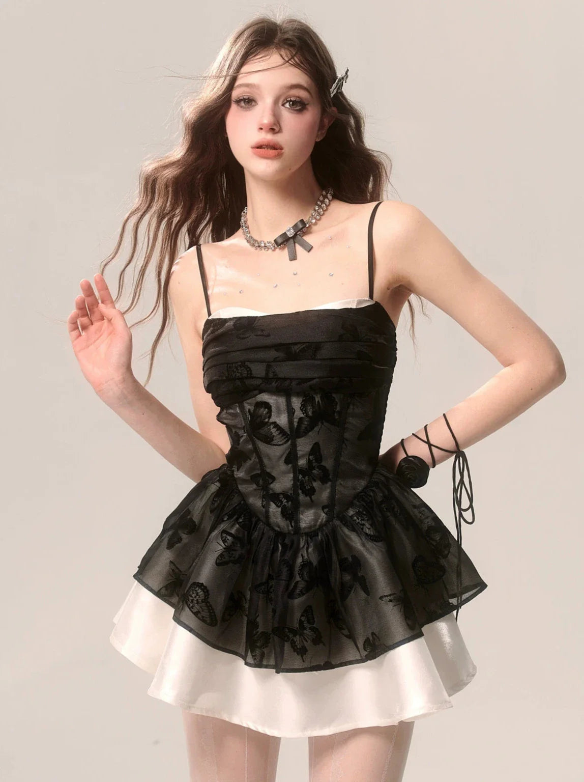 愛らしいフェイクサテンのフレンチツーピース バタフライサスペンダー ブラックドレスで、美しく輝きましょう。繊細なバタフライ柄と、体型を美しく見せるツーピースデザインが特徴です。フェイクサテン素材がエレガントな雰囲気を添え、どんなシーンにもぴったりです。この素敵なドレスで、あなたのキュートでチャーミングな一面を堪能してください。