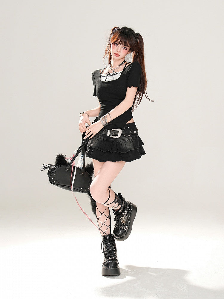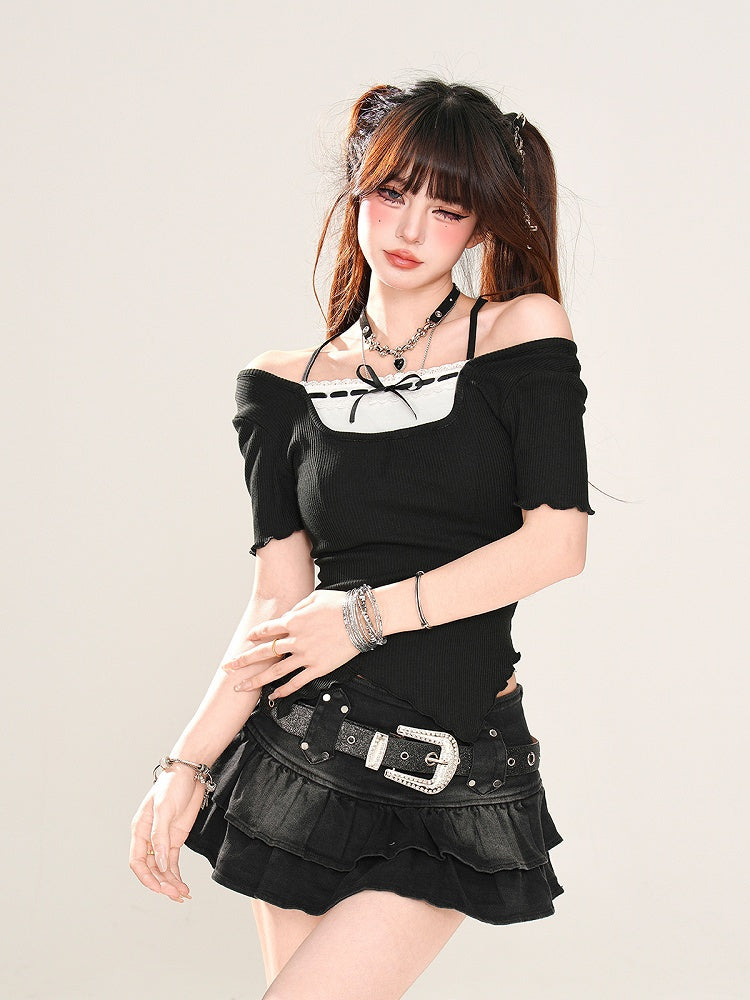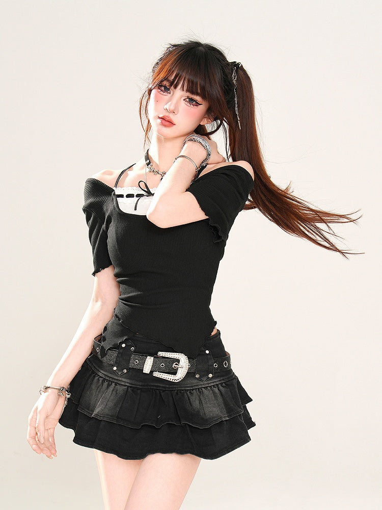 ブラックのオフショルダーネックライン、カーブヘムのグラマラスTシャツ、フェイクツーピース