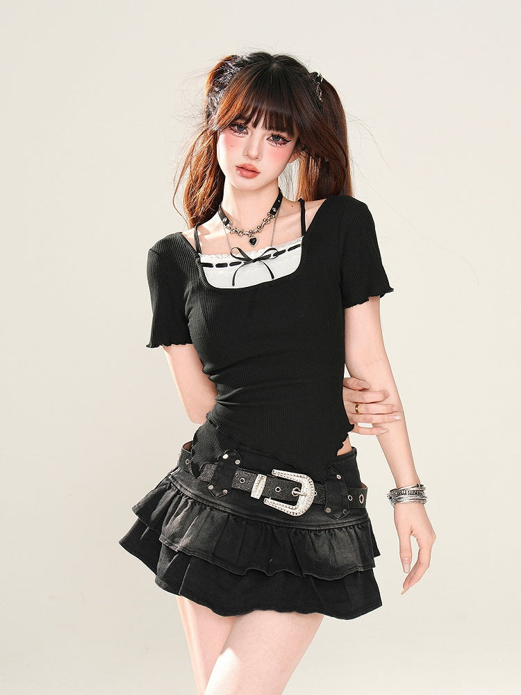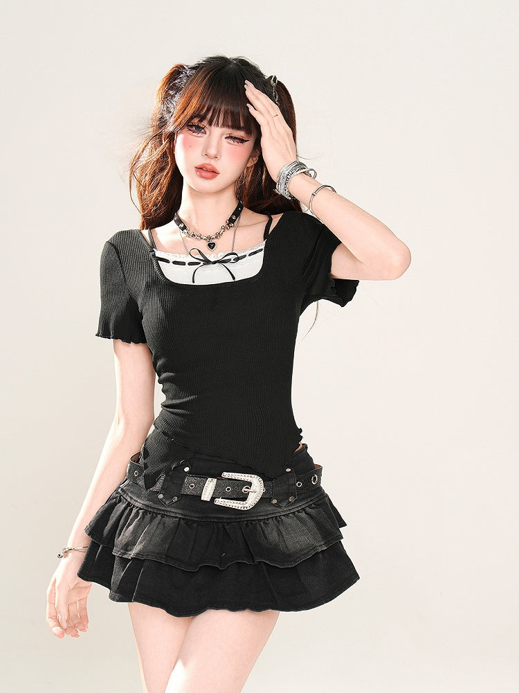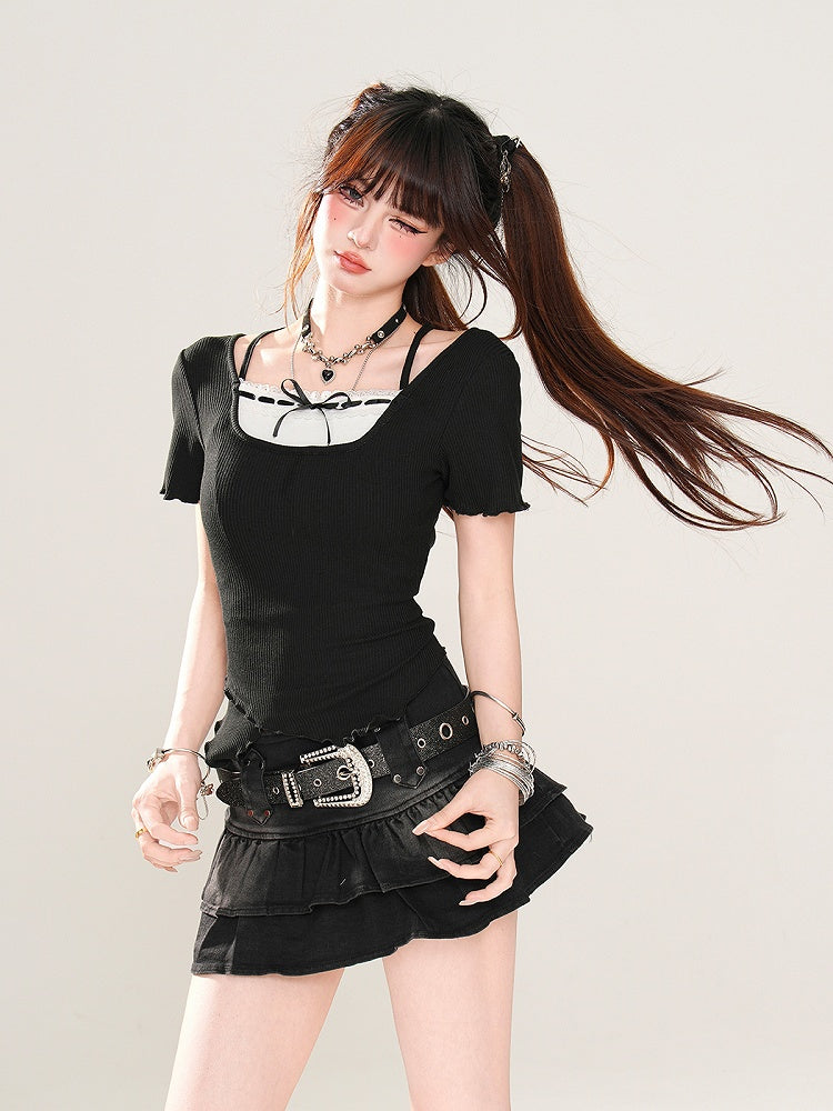 フェイクツーピースネックライン、カーブヘム、ブラックオフショルダーグラマラスTシャツ