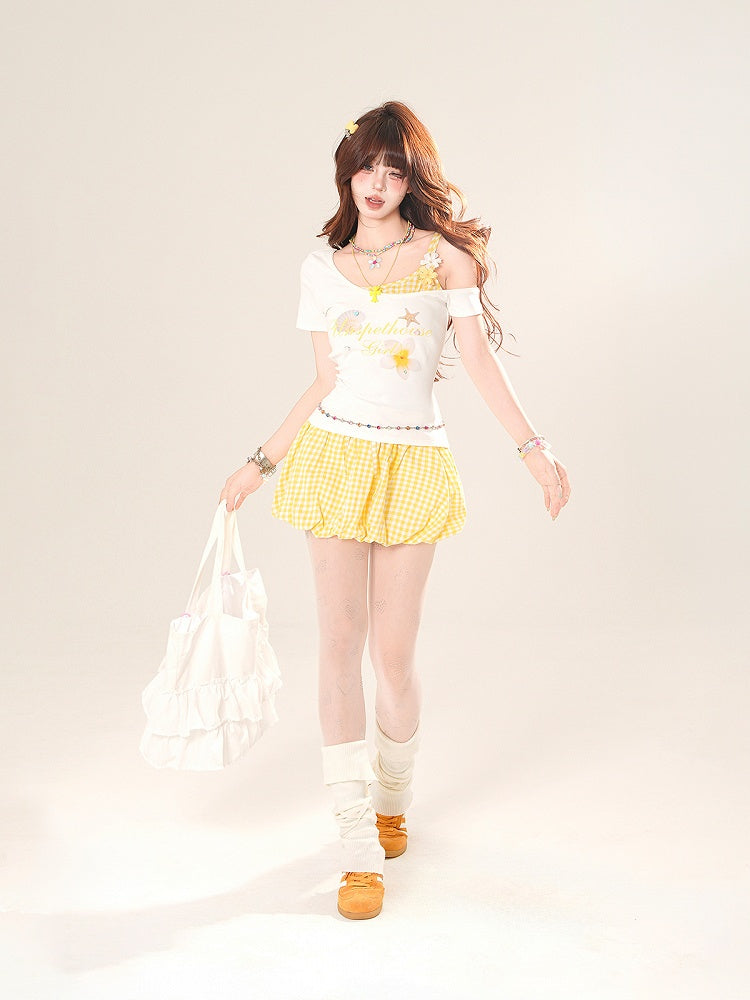 ホワイト/ブラック アシンメトリーネックライン 花柄アクセント フェイクツーピースTシャツ