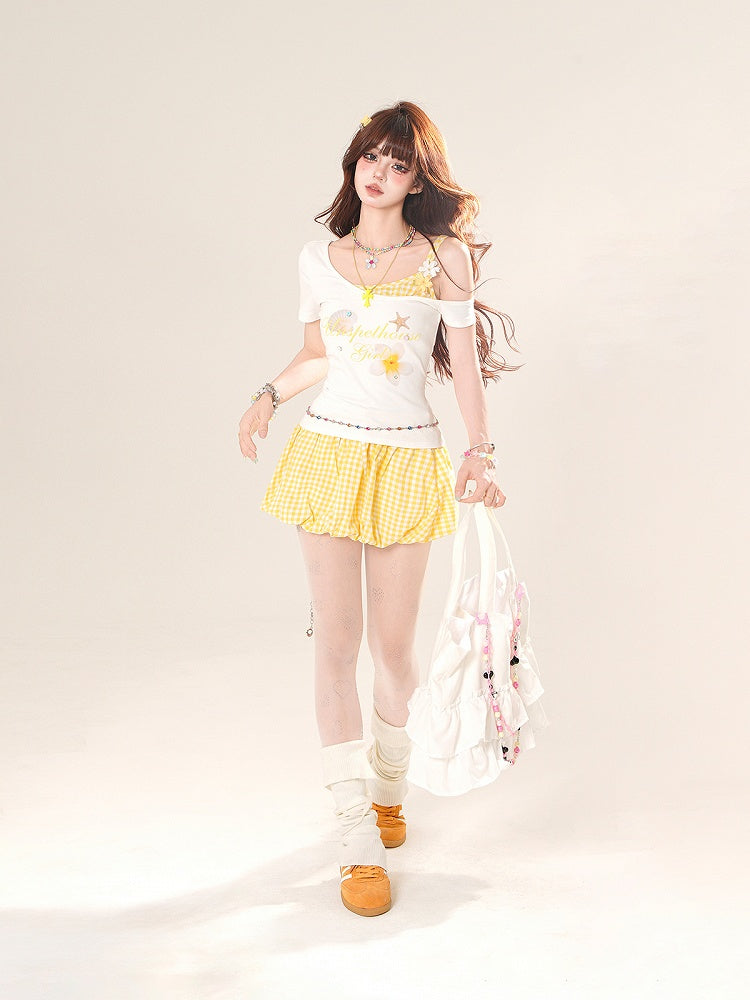 フェイクツーピースTシャツ アシンメトリーネックライン 花柄アクセント ホワイト/ブラック