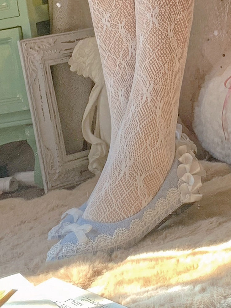 Blue Elegant Lolita Slip-On Flats - Pointed Toe with Bow Accent, Lace Details and Lotus Edge Back