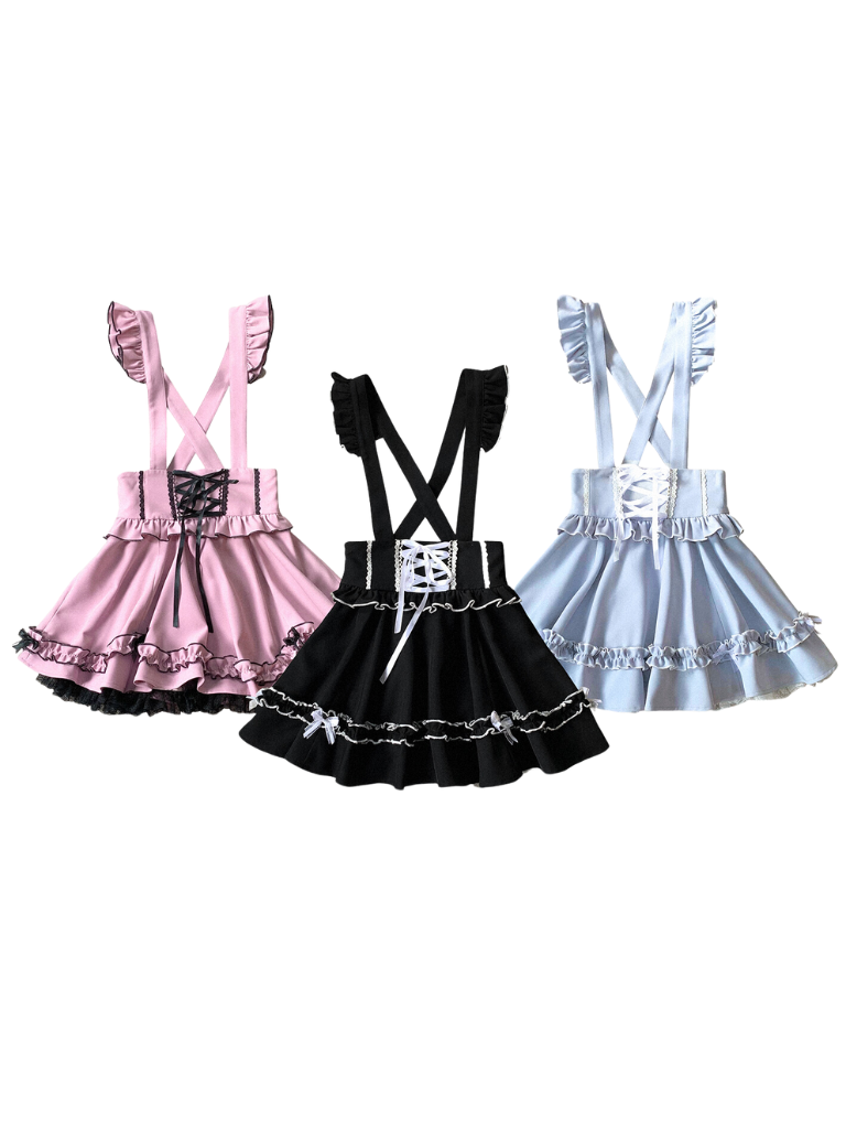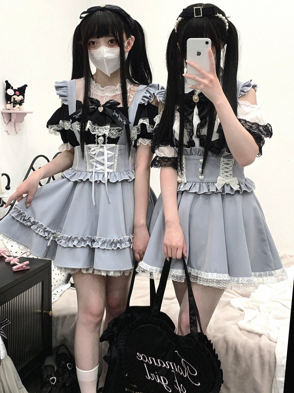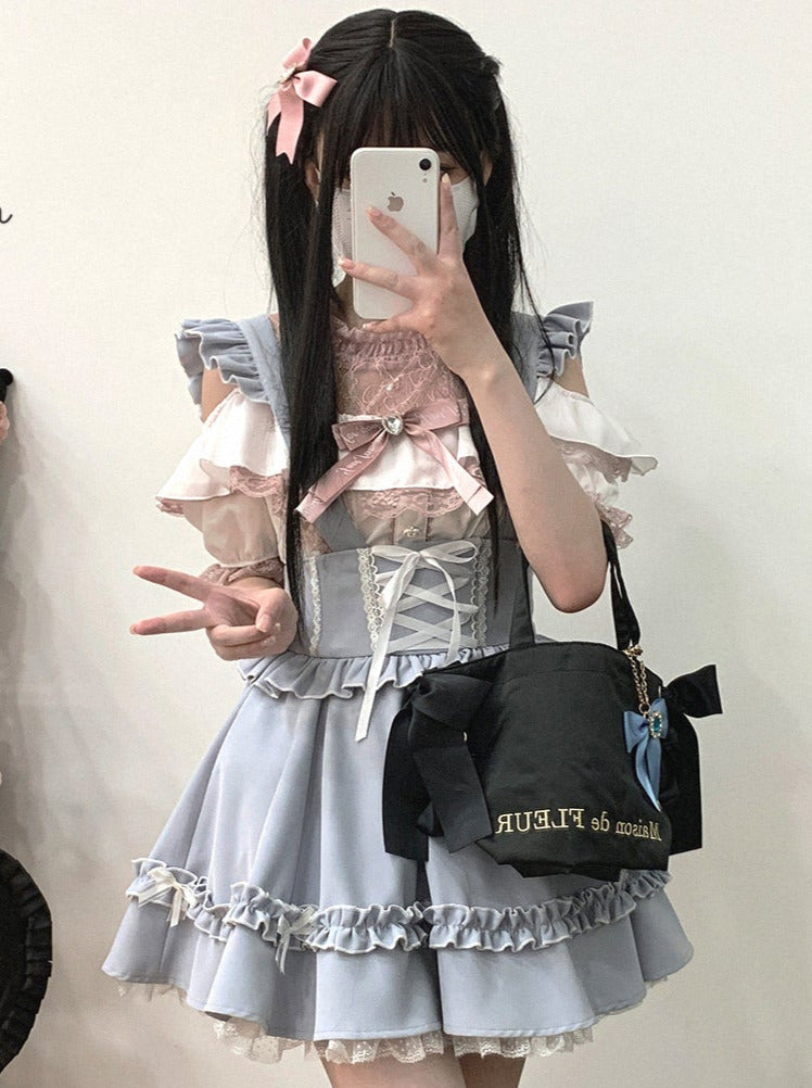 青と白のオールドスクールロリータファッションドレス 蝶結びディテール JSK セット