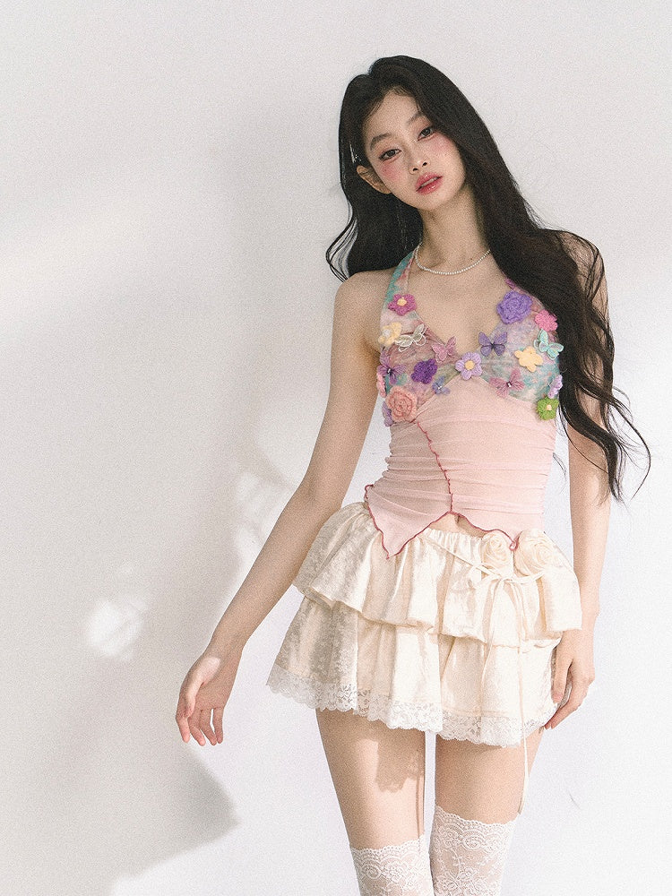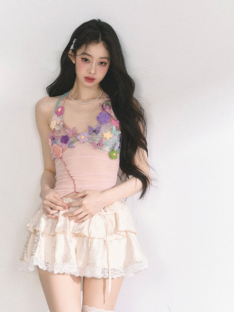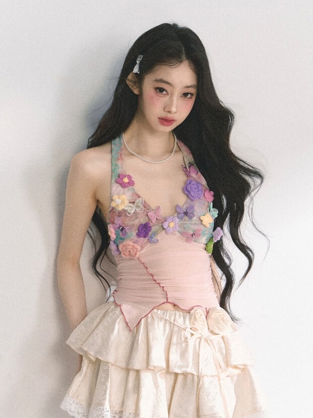 ピンクのレタス裾ニット花柄ホルターネックトップス