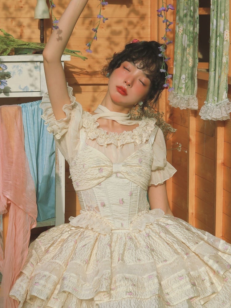 ピンクと白のオールドスクールロリータファッションドレス、蝶結びディテール、ロリータJSKセット