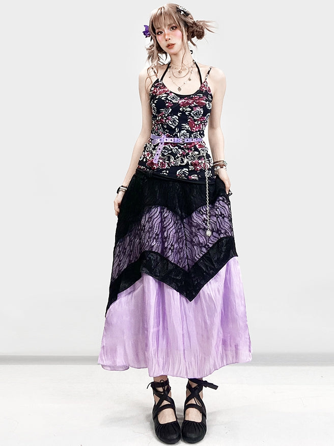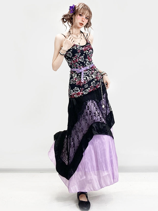 + 花柄トップ、ホルターネック、アンダースカート、キャミスカート、レースセット、ドレス、ホリデーネック、ブラック、パープル、ビタースイート