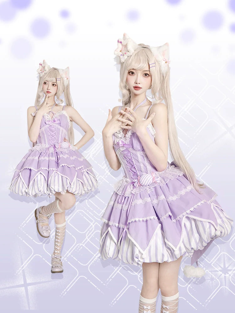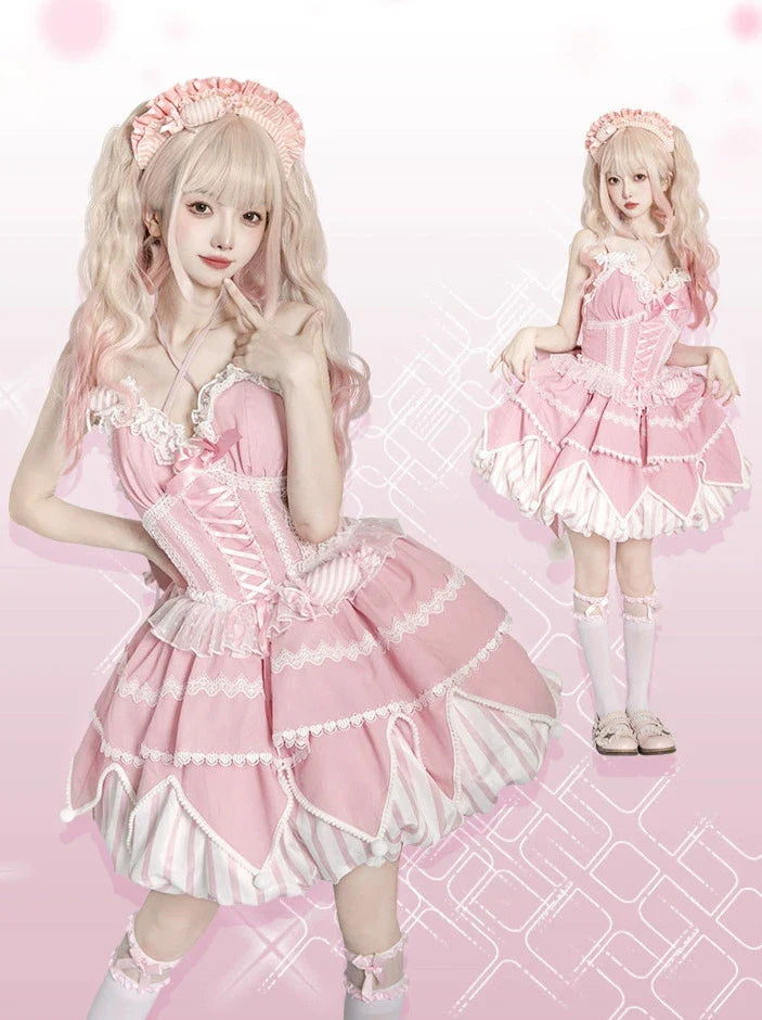 ピンクと白のオールドスクールロリータファッションドレス、蝶結びディテール、ロリータJSKセット