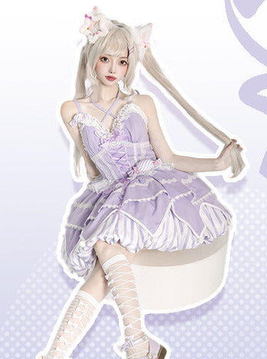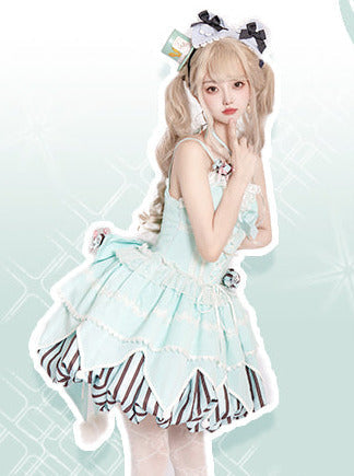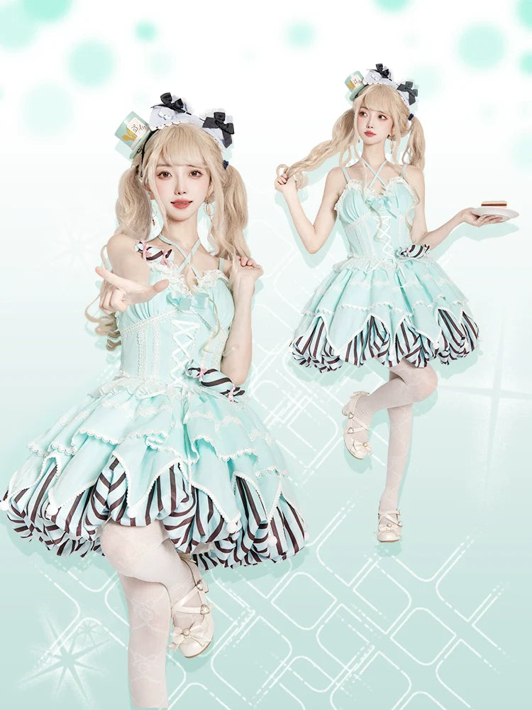 青と白のオールドスクールロリータファッションドレス 蝶結びディテール JSK セット