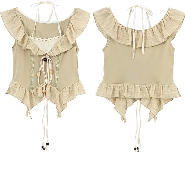ライトグリーンのフラッタースリーブ、セルフタイビーズストラップ、カーブヘムホルターネックトップス