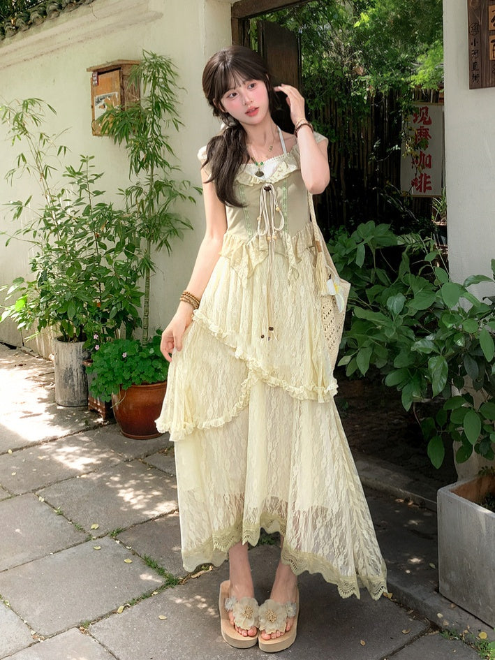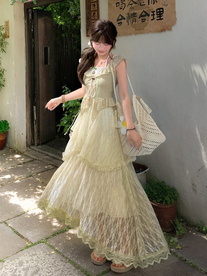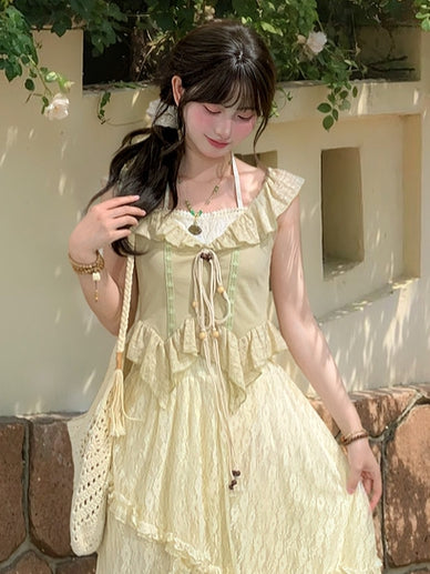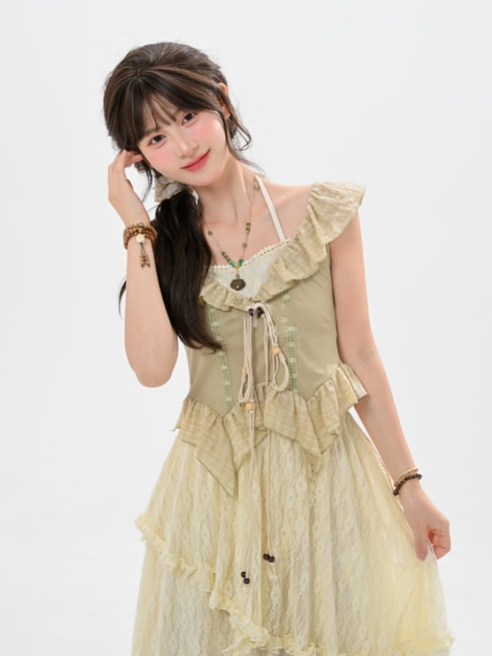 フラッタースリーブ、セルフタイビーズストラップ、ライトヘム、カーブグリーンホルタートップ