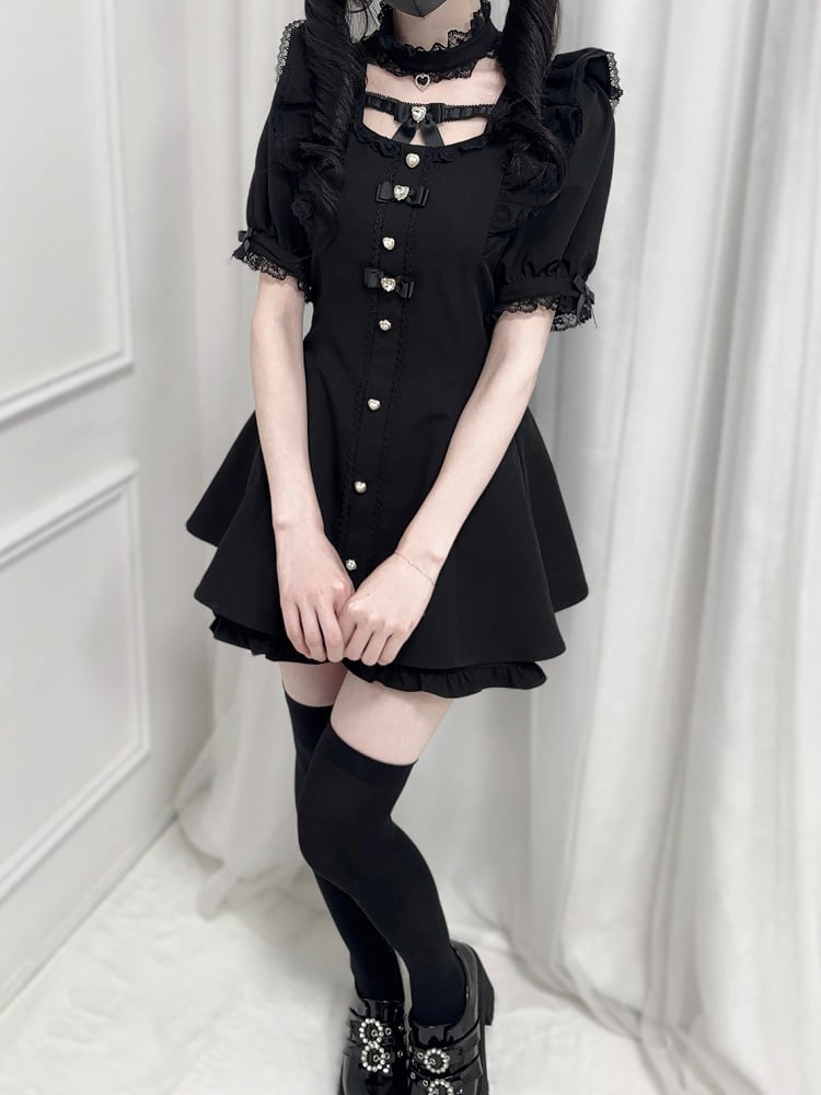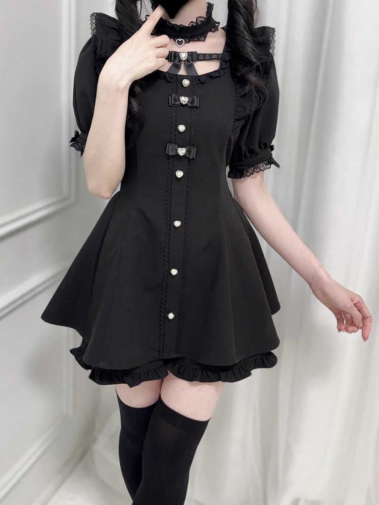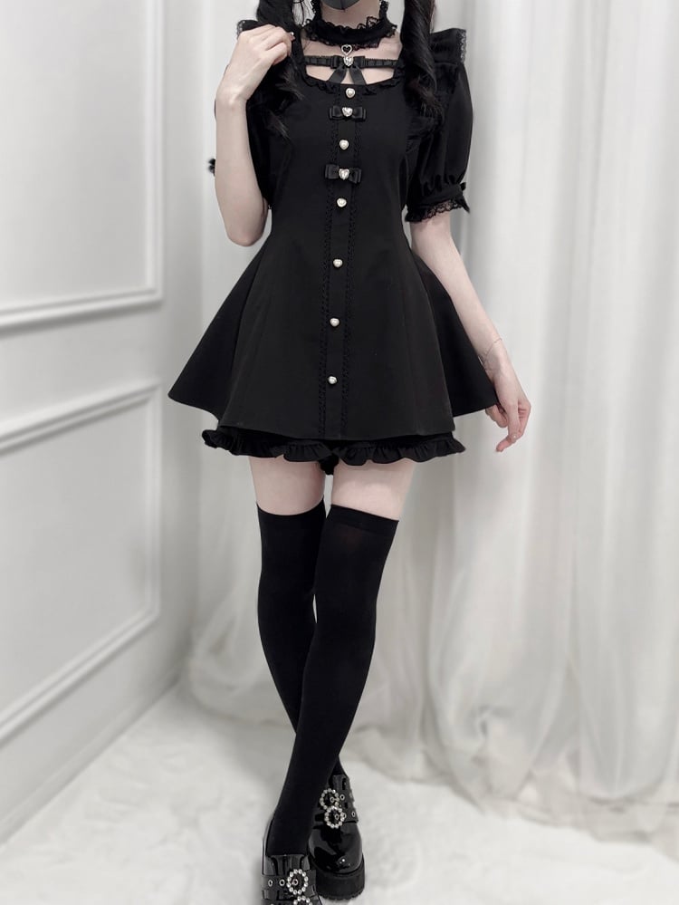 ブラック ジライケイ セット - フリル袖 セルフタイ ボウバック ミニドレス + ショートパンツ + チョーカー