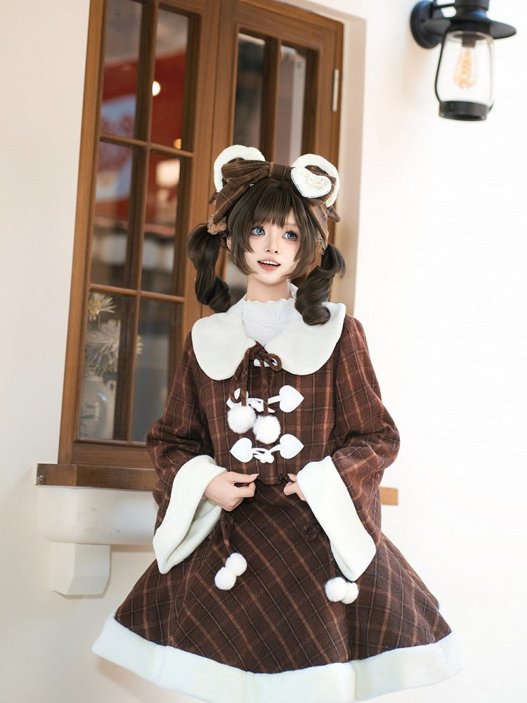 Brown Plaid Cherry Embroidered Sweet Lolita Dress Paired with Coat for Autumn and Winter