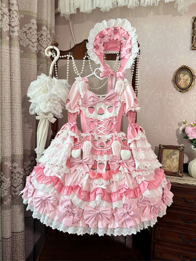 クリーミーストロベリーバニーピンクのスイートロリータ4点セット - ティアードスカートワンピース+袖+ボンネット+チョーカー