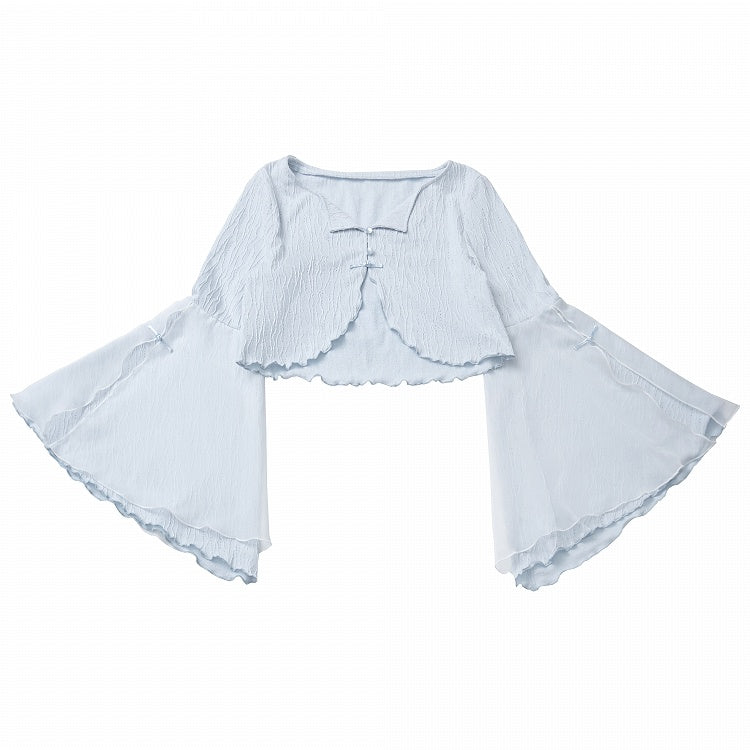 フリートップノットチャイナドレススタイルクロップドキャミソールボタンベルスリーブブルーカーディガン