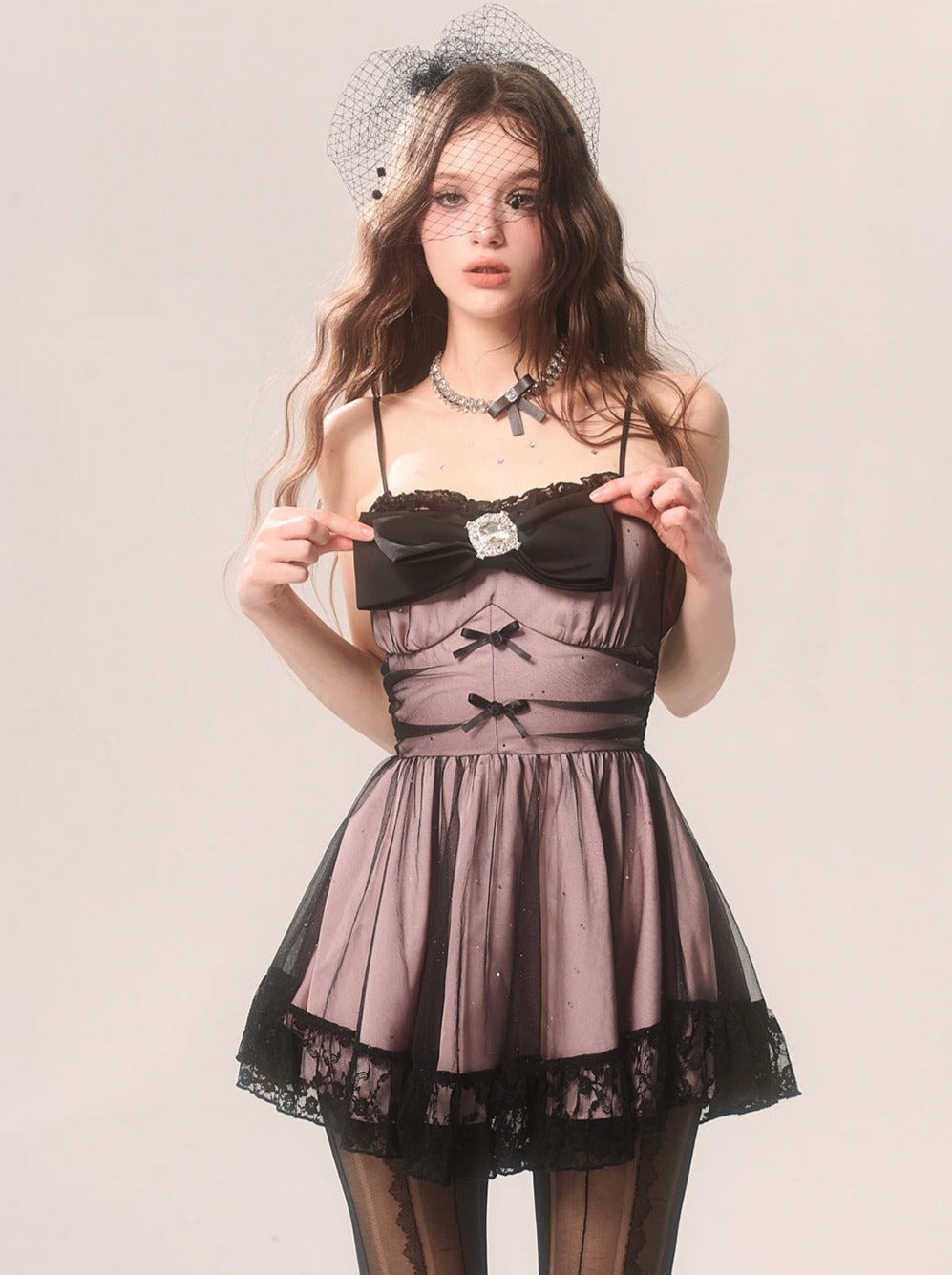 ピンクと白のオールドスクールロリータファッションドレス、蝶結びディテール、ロリータJSKセット