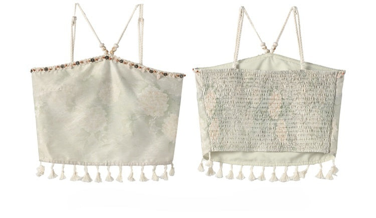 ライトグリーンのホルターネック、花柄プリント、フリンジヘムのホリデートップス
