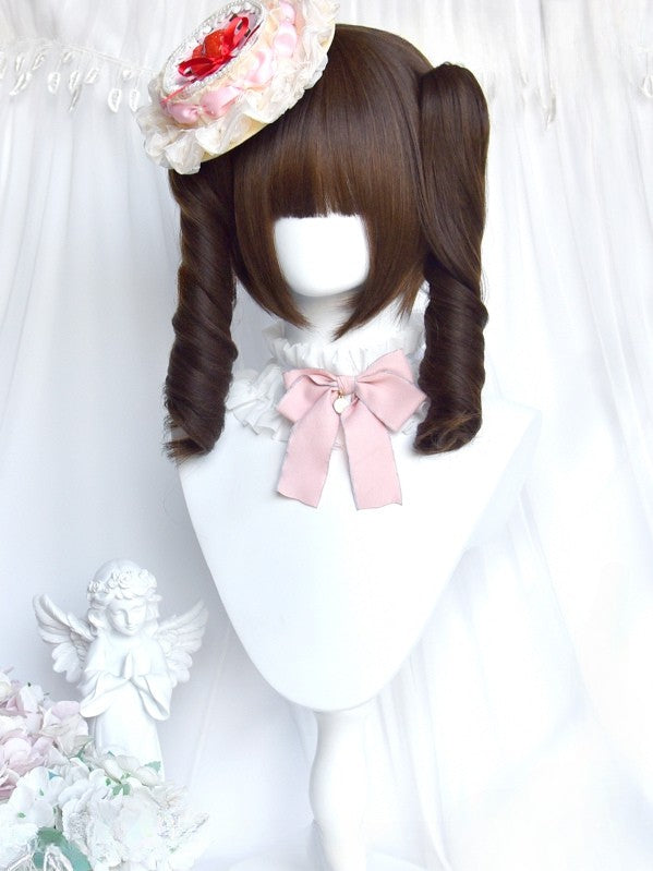 ブラウン 22cm ショートストレートウィッグ(フルバング付き)+ 30cm ダブルローマンカーリーポニーテールクロークリップ