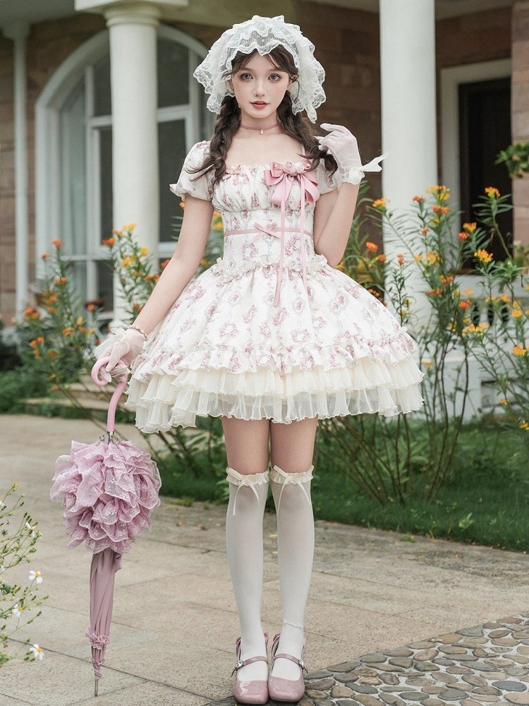 ロゼットプリント 伸縮性のあるスクエアネックライン ショートバージョン クラシックロリータ OP フルセット