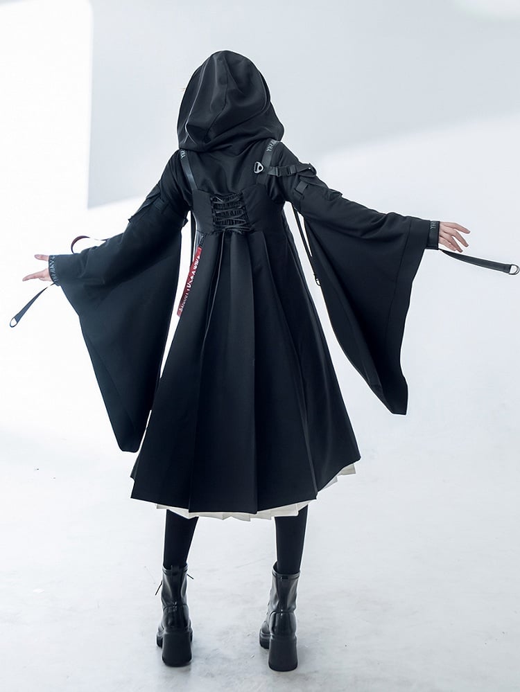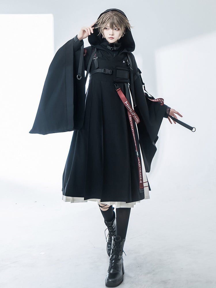 未来的なテックウェアのバックルディテール、ブラック&ホワイトのプリーツJSKドレス