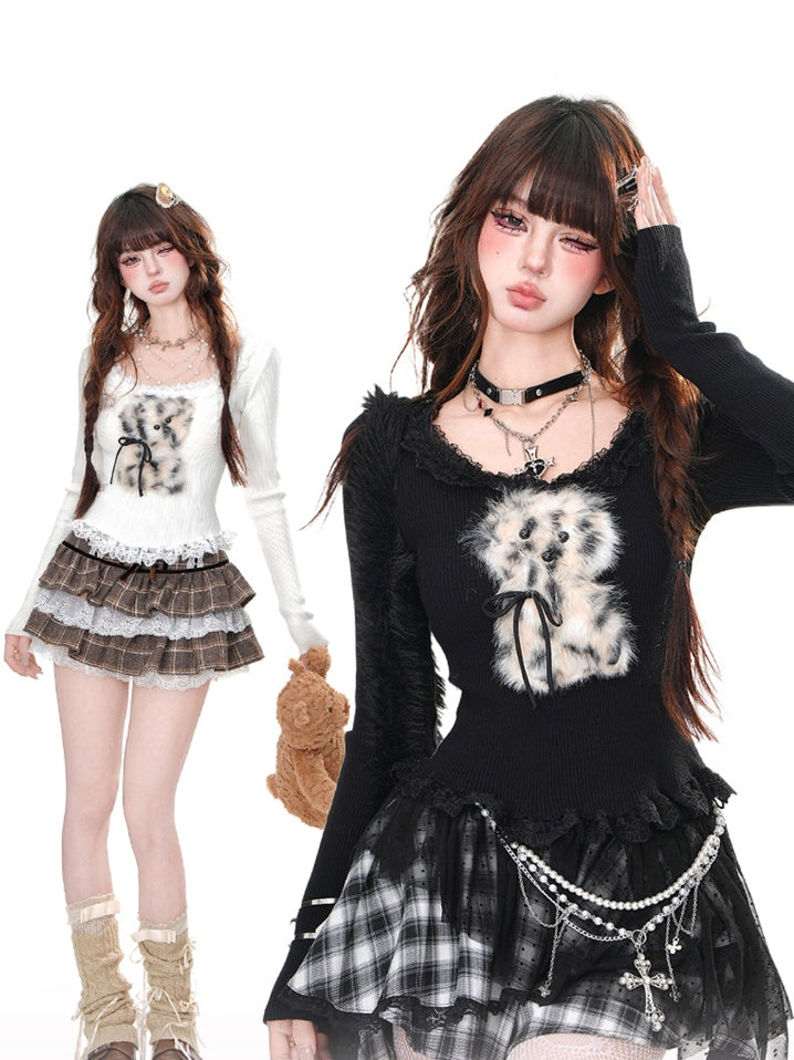 Acubi Fashion 愛らしいぬいぐるみの子犬のフリルネックラインと裾 ブラック/グレー/ホワイト グラマラスニットトップス