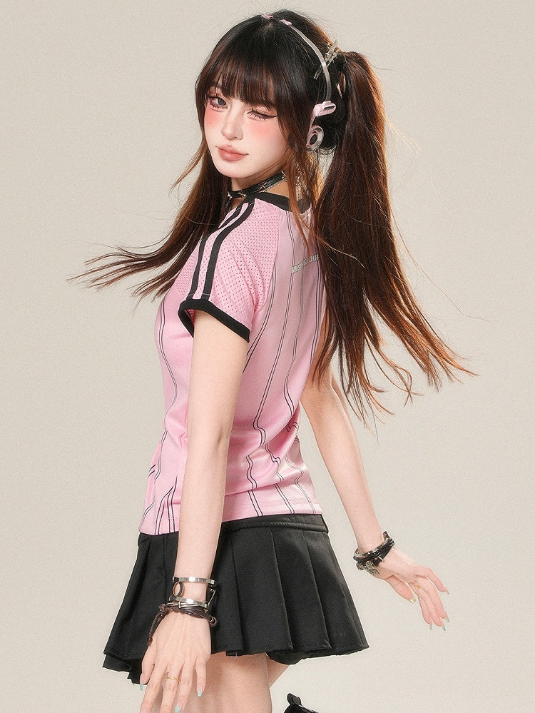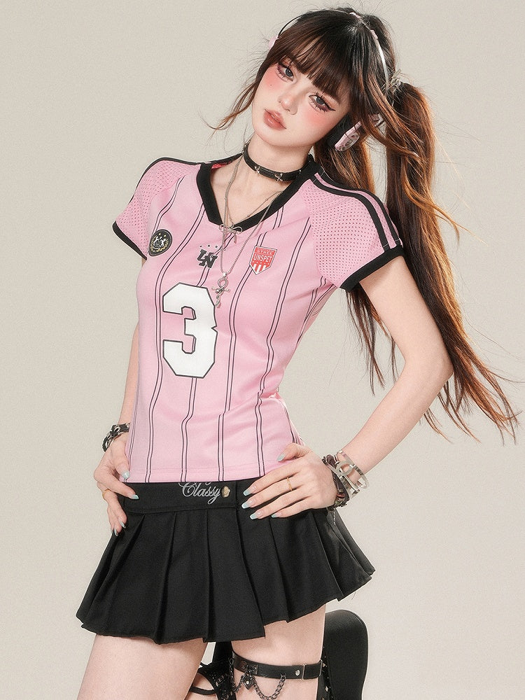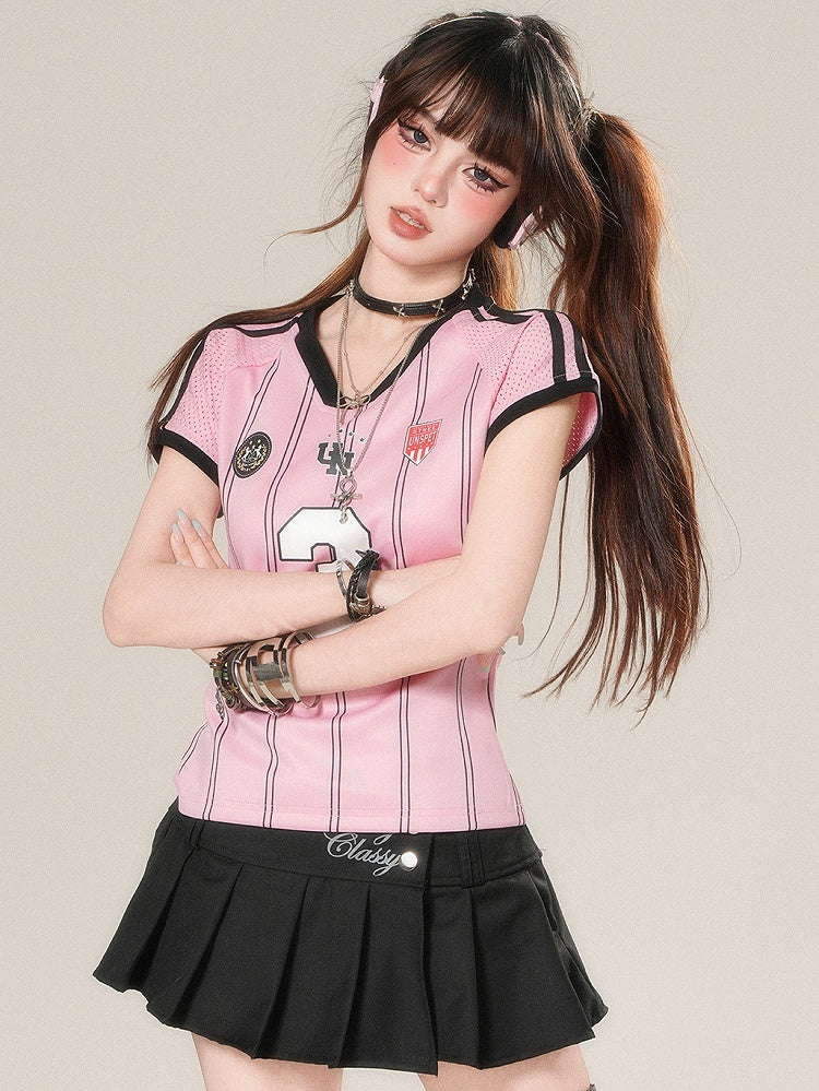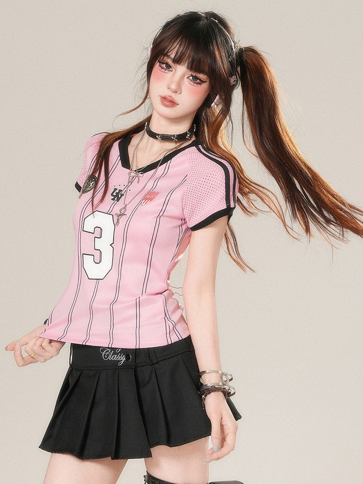 ピンクの華やかなストライプ柄ナンバープリントVネックTシャツ
