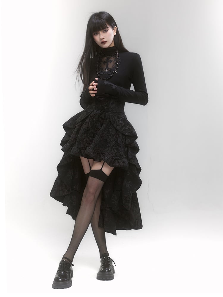 ブラックのハイウエスト・ハイロー・ラッフルスカートで、ゴシックスタイルをワンランクアップ。フロントの繊細なレースアップディテールが、エッジの効いたこのアイテムにロマンチックな雰囲気を添えます。ハイウエストとハイロー・ラッフルヘムが、体型を美しく引き立てるデザイン。どんな人混みの中でも、ひときわ目を引く存在感を放ちます。