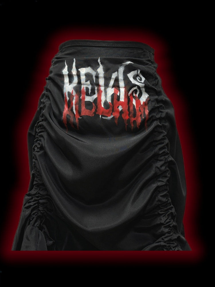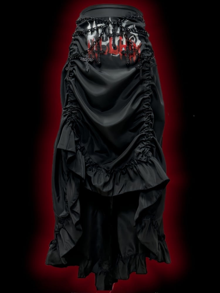ゴシックなブラックレタープリントのルーシュハイローパンクスカートで、キュートなゴスに変身しませんか? ルーシュデザインが個性的なタッチを添え、ウエストにあしらわれたクロスチャームチェーンが遊び心をプラス。ワードローブにエッジの効いた魅力をプラスするのにぴったりです!