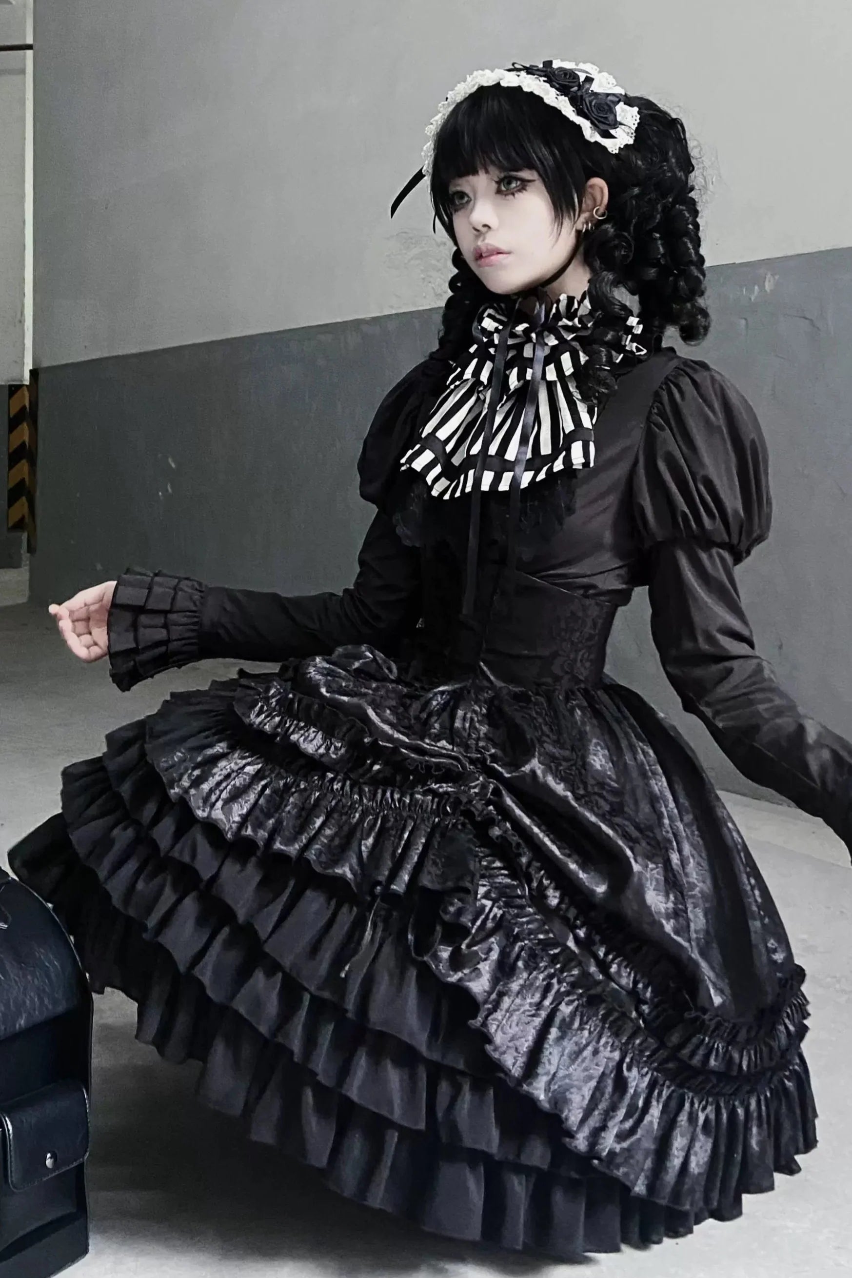黒と白のオールドスクールロリータファッションドレス蝶結びロリータJSKセット