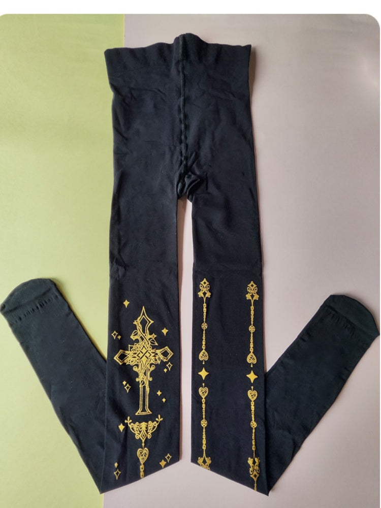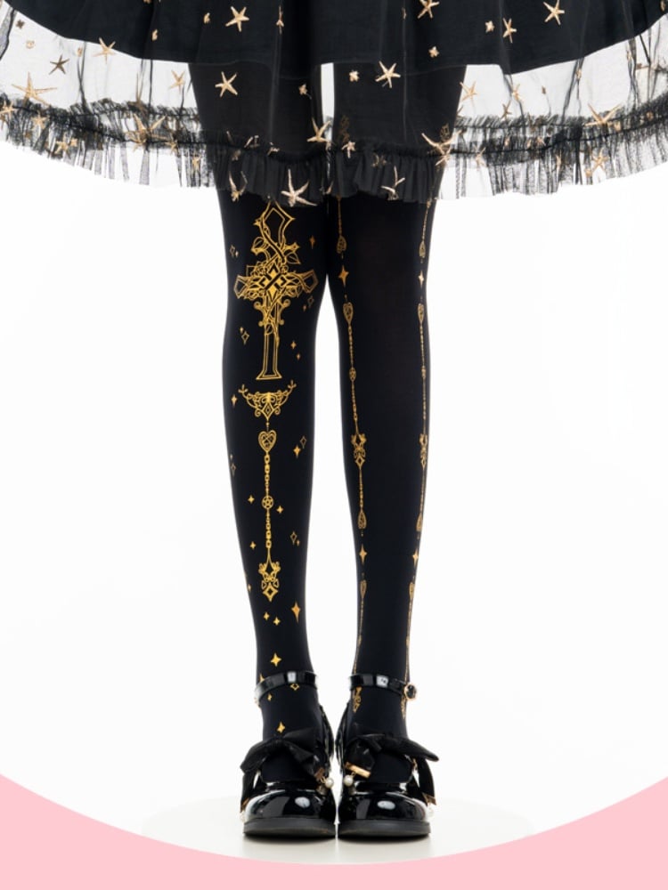 ゴシックロリータ ゴールドクロスプリント ブラックタイツ