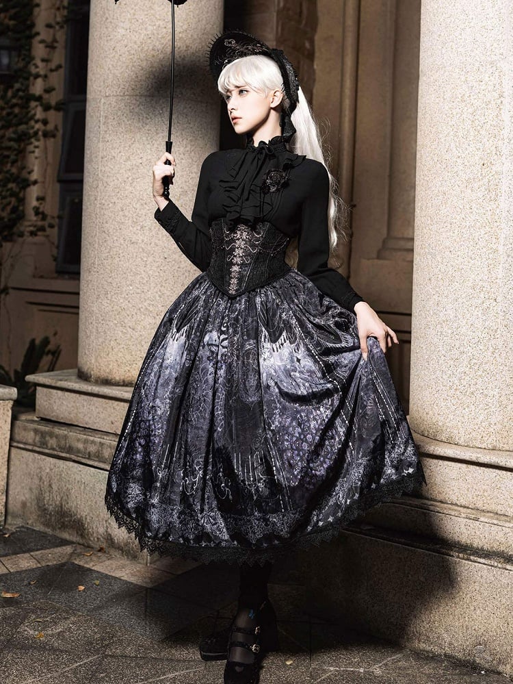 Gothic Lolita Butterfly and Ribs Print Skirt with Elastic Waist