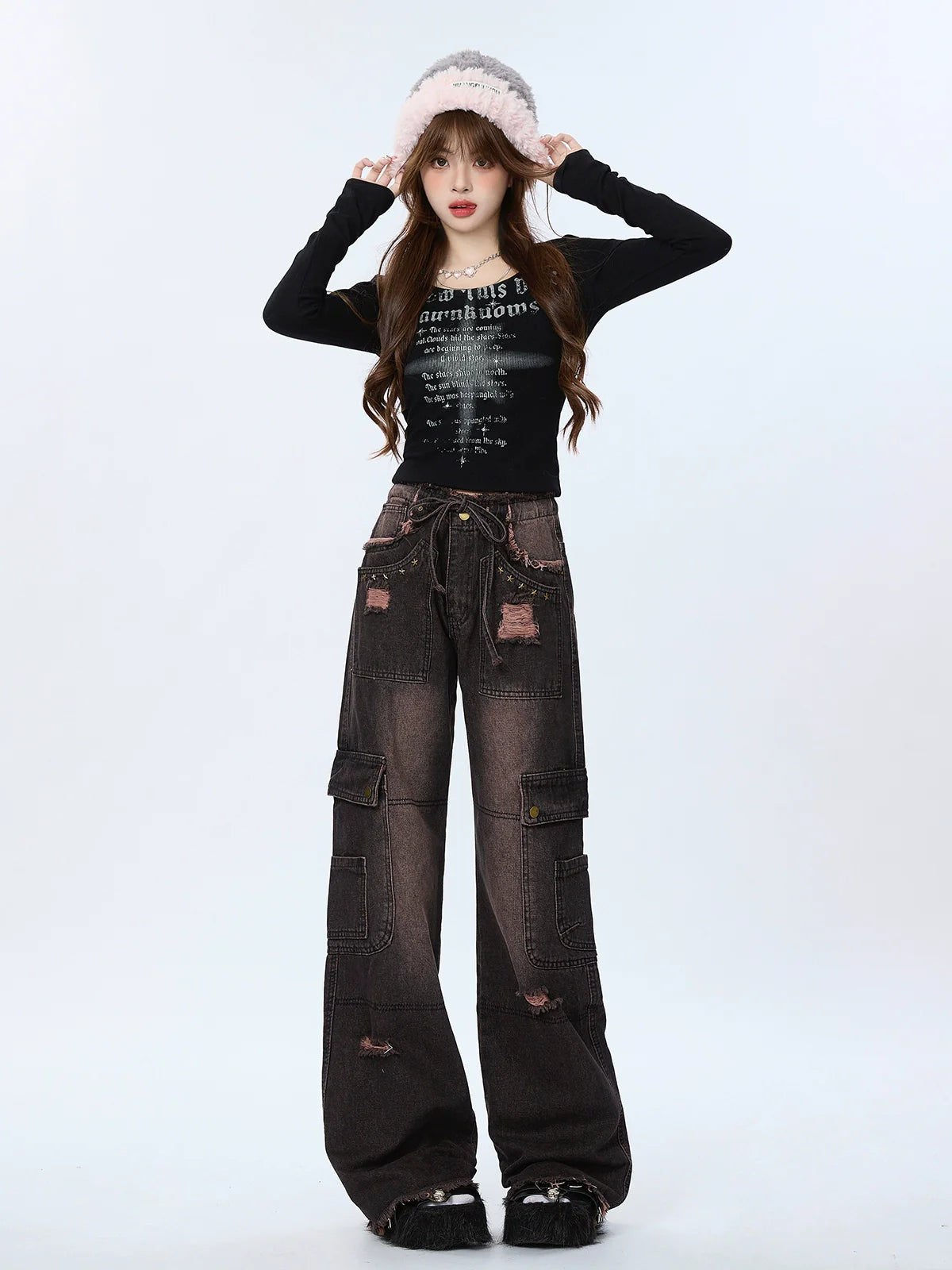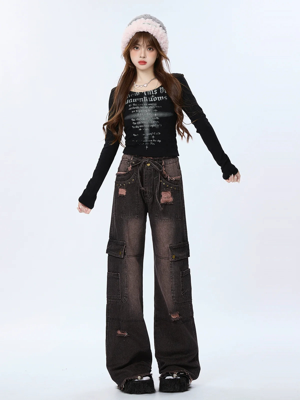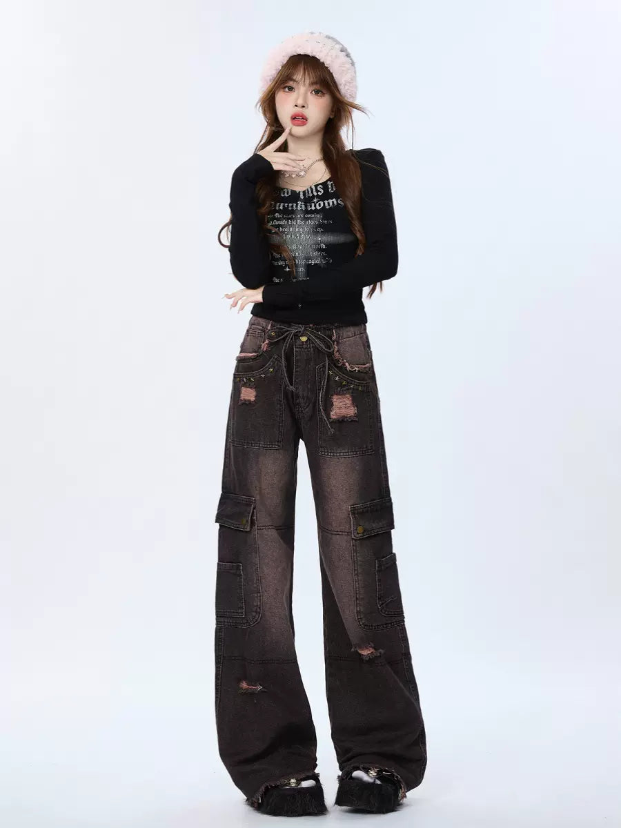 キュートなグラデーションのレトロカーゴデニムダメージブラックパンツは、どんなコーディネートにも遊び心をプラス。個性的なグラデーションデザインとダメージ加工のディテールがファッショナブルな印象を与え、カーゴポケットは実用性も兼ね備えています。現代のトレンドセッターにぴったりのアイテムです。