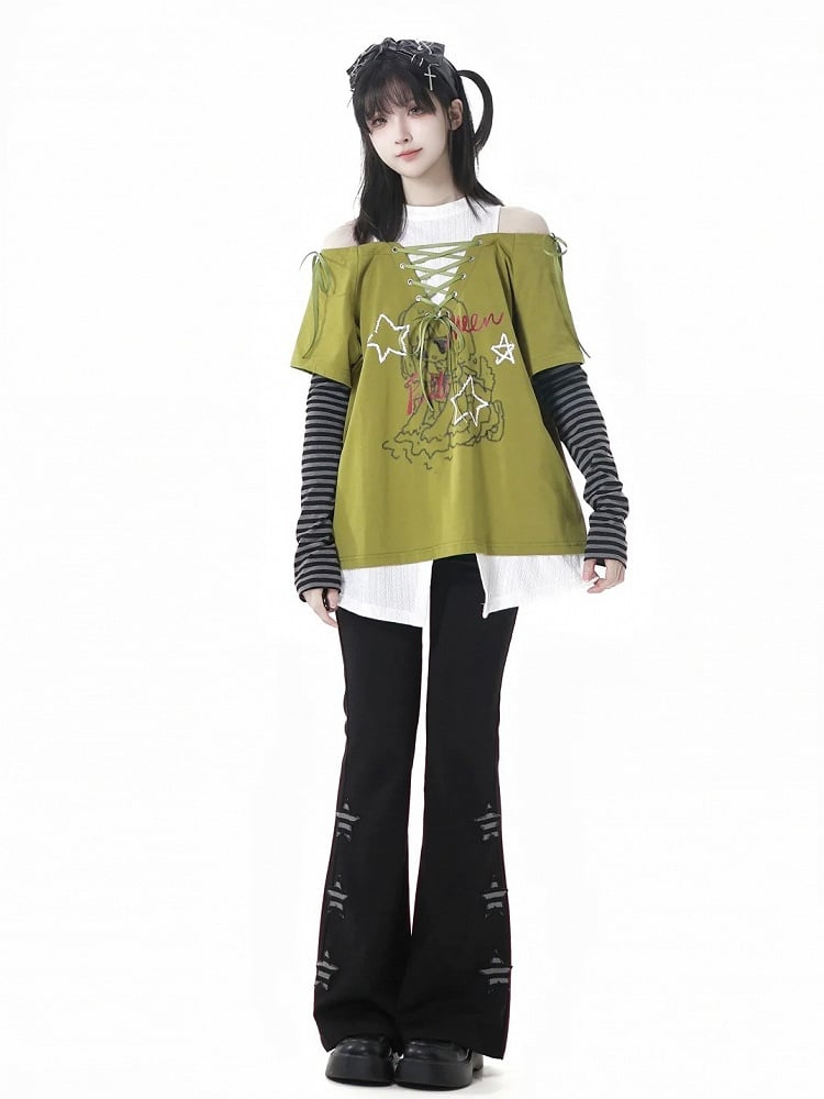 グラフィックTシャツ ネックライン フェイクツーピース グリーン/ブラック カットアウトショルダー レースアップ