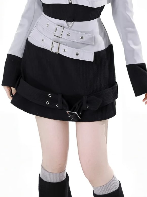 グレーとブラックのニットカラーブロックデザインバックルストラップスカート