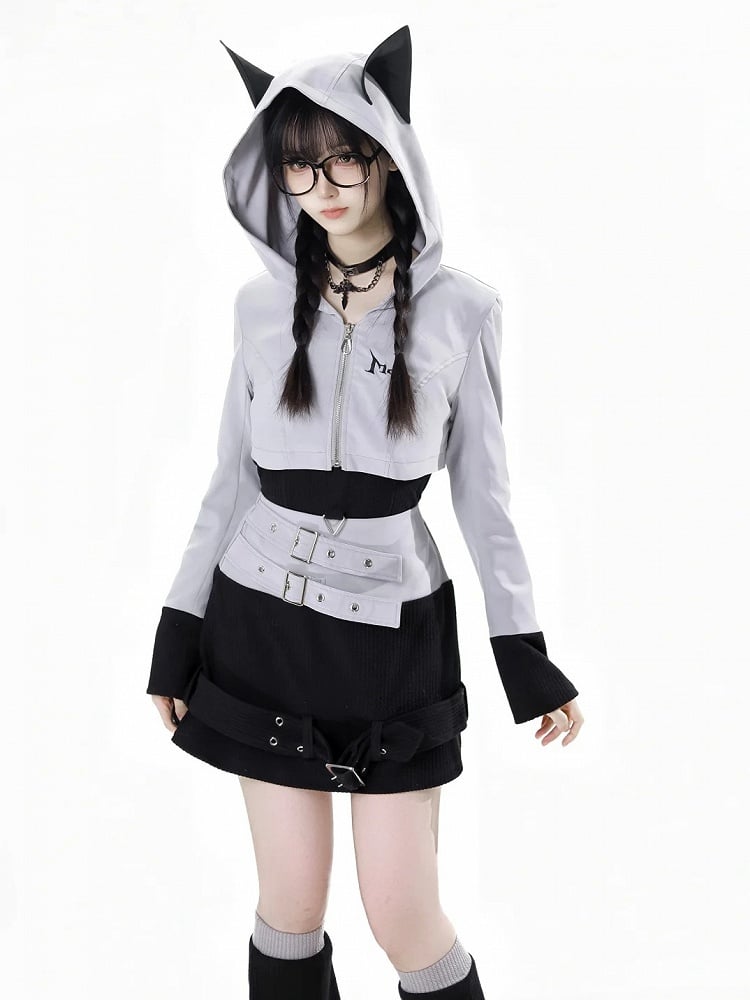 グレーのバックルニットカラーブロックストラップスカートブラックデザインと