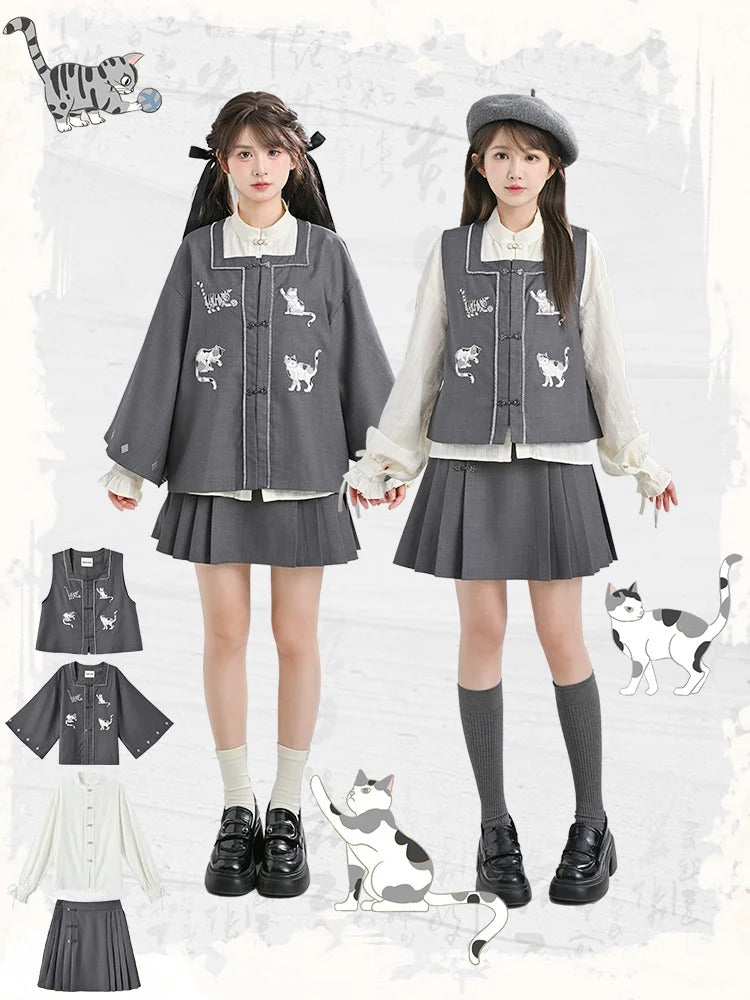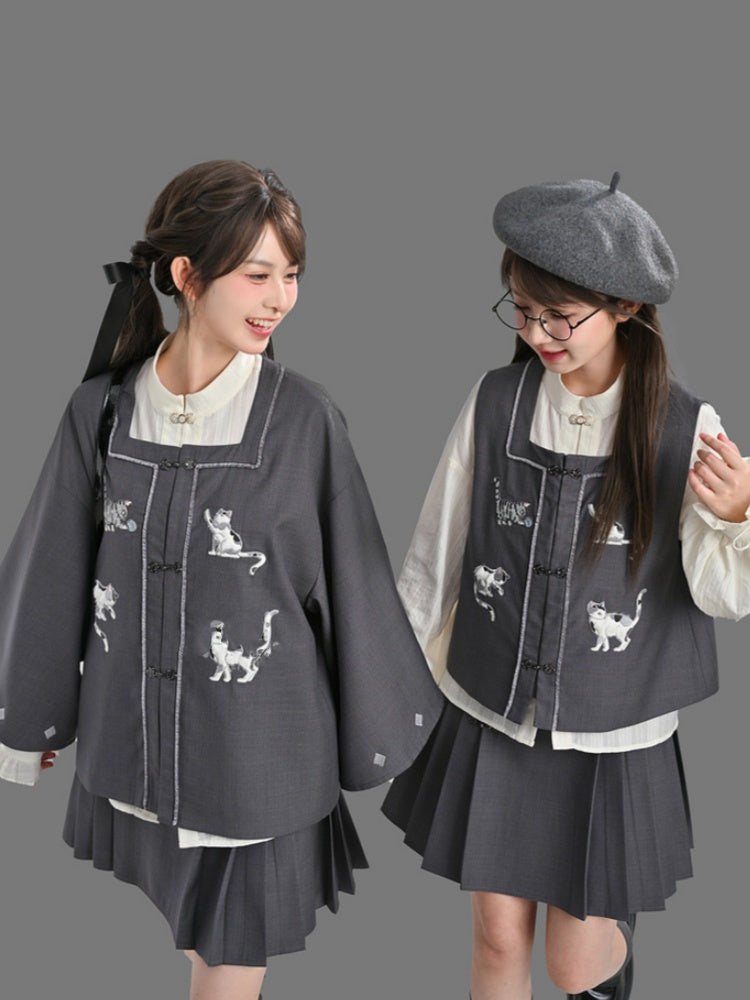 グレーのチャイナドレス風スクエアネックラインの猫刺繍ノットボタンベスト