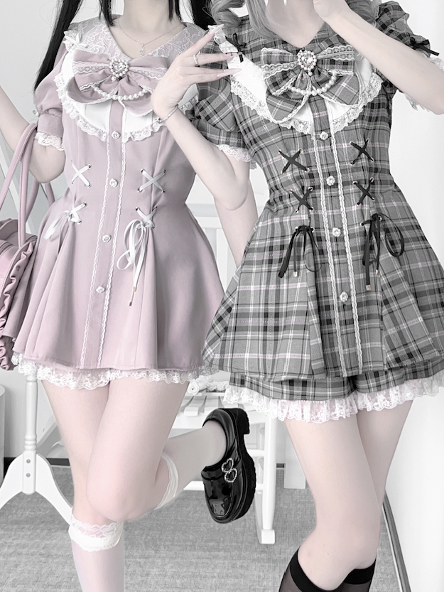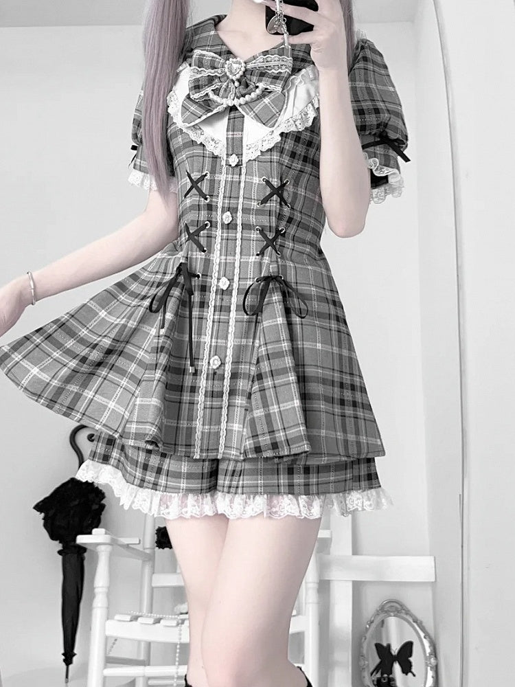 グレーのレースアップディテール、ウエストラインストーン装飾のミニドレス+ショーツ、ジライケイチェック柄セット